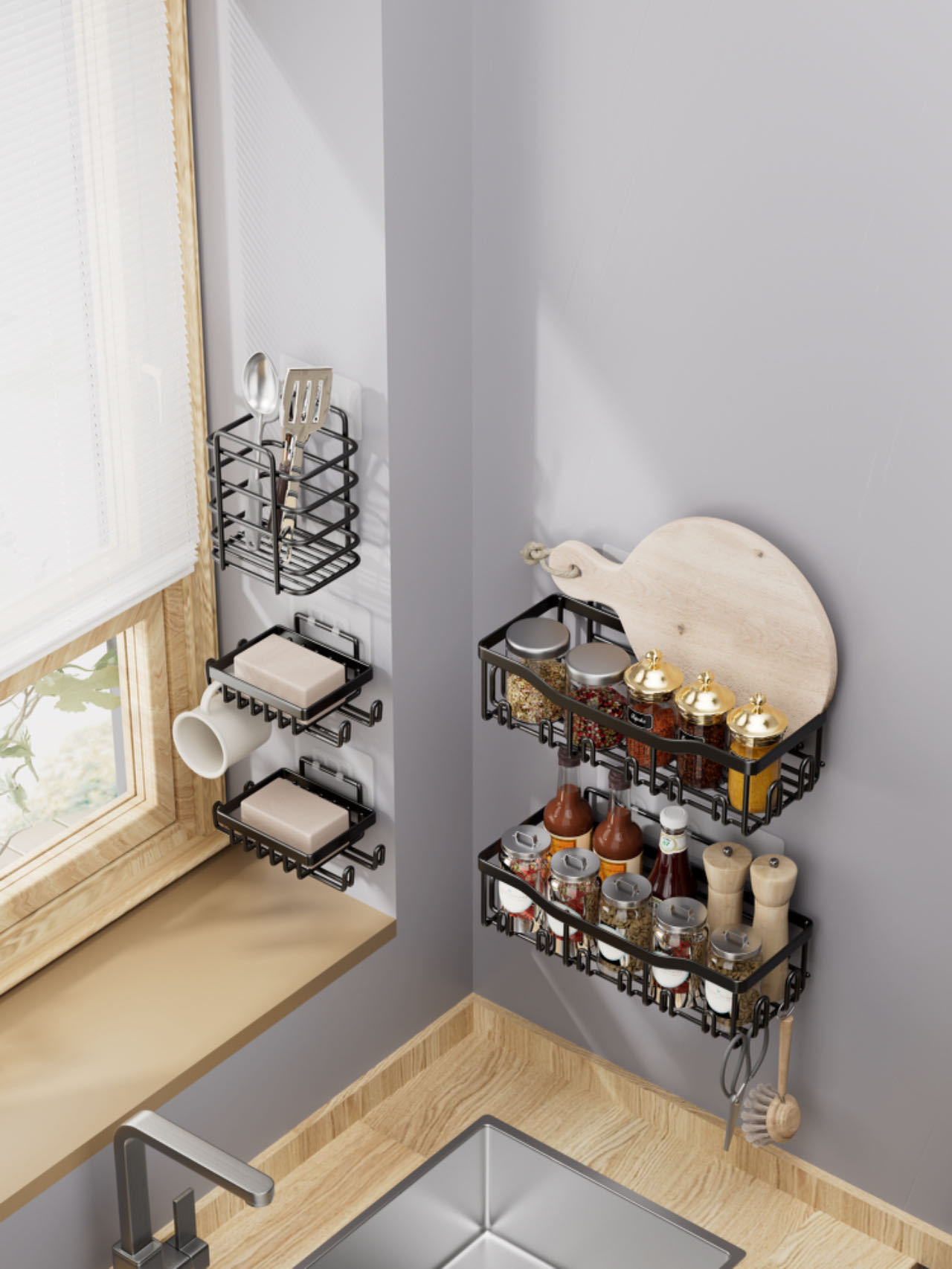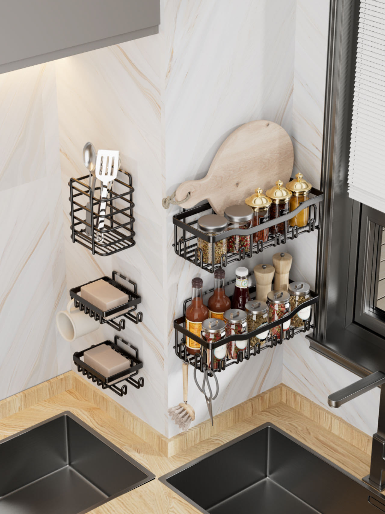 Bathroom Storage Rack Kitchen Organizer Shelf Black Shelves Corner Frame Iron Shower Punch Free Mounted Caddy Rack