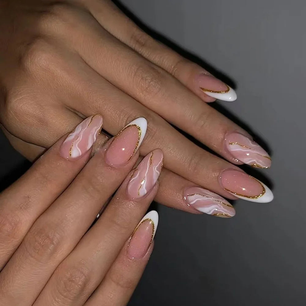 Popxstar 24Pcs 3D Flower Design Fake Nail Almond French Press on Nails with Pink Gradient Reusable Simple Finished False Nails Manicure