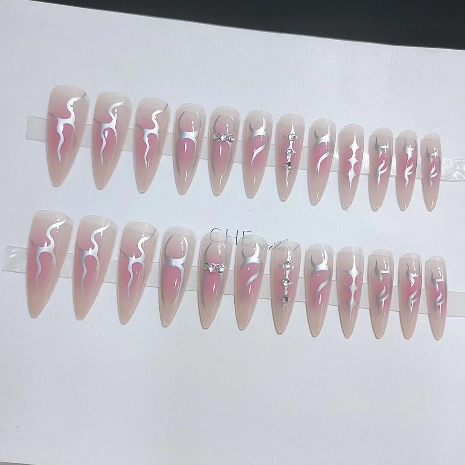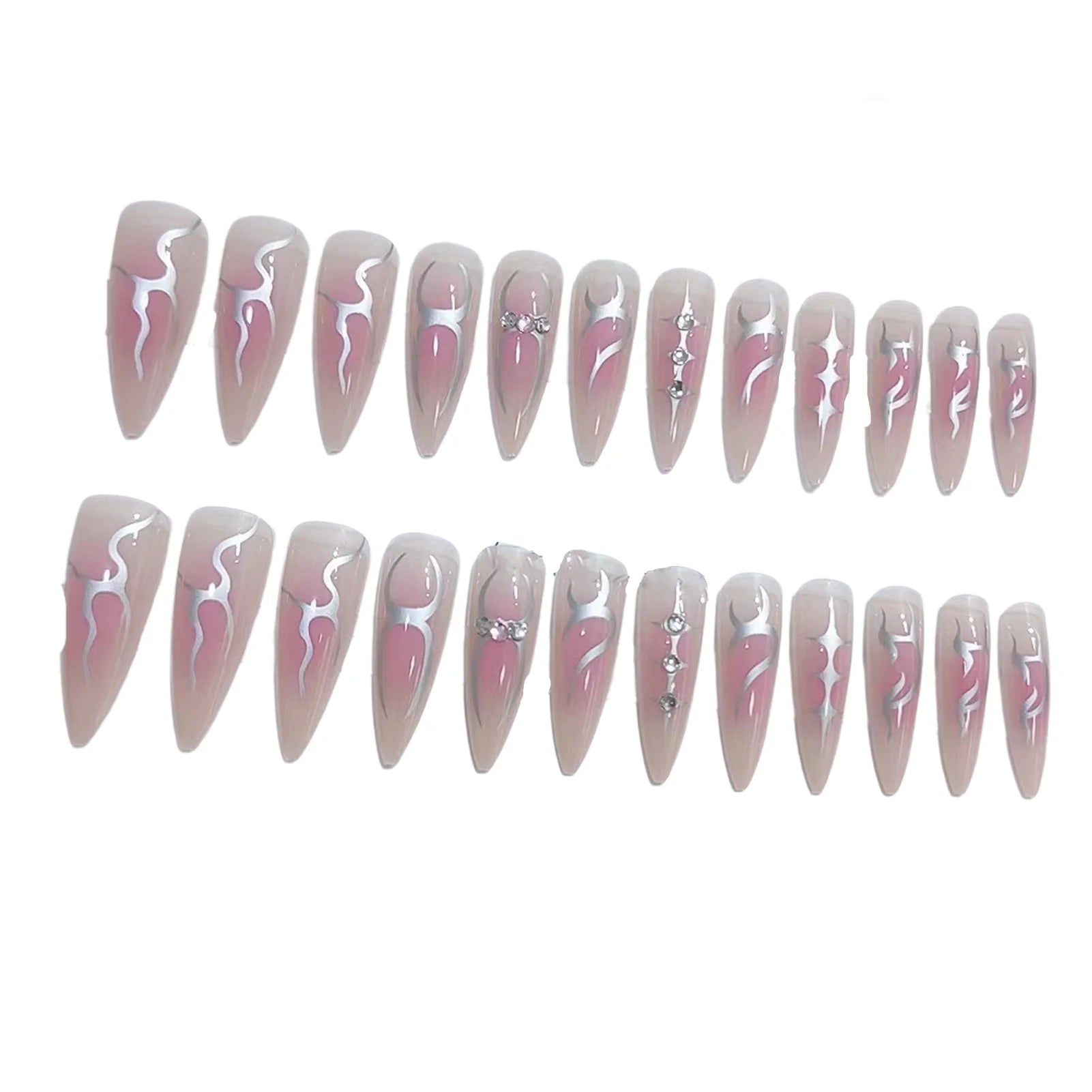 Popxstar 24Pcs Blush Pink Fake Nails with Silver Flame Designs Long Stiletto Press On Nails Spicy Girls Halloween Party Charm Manicure