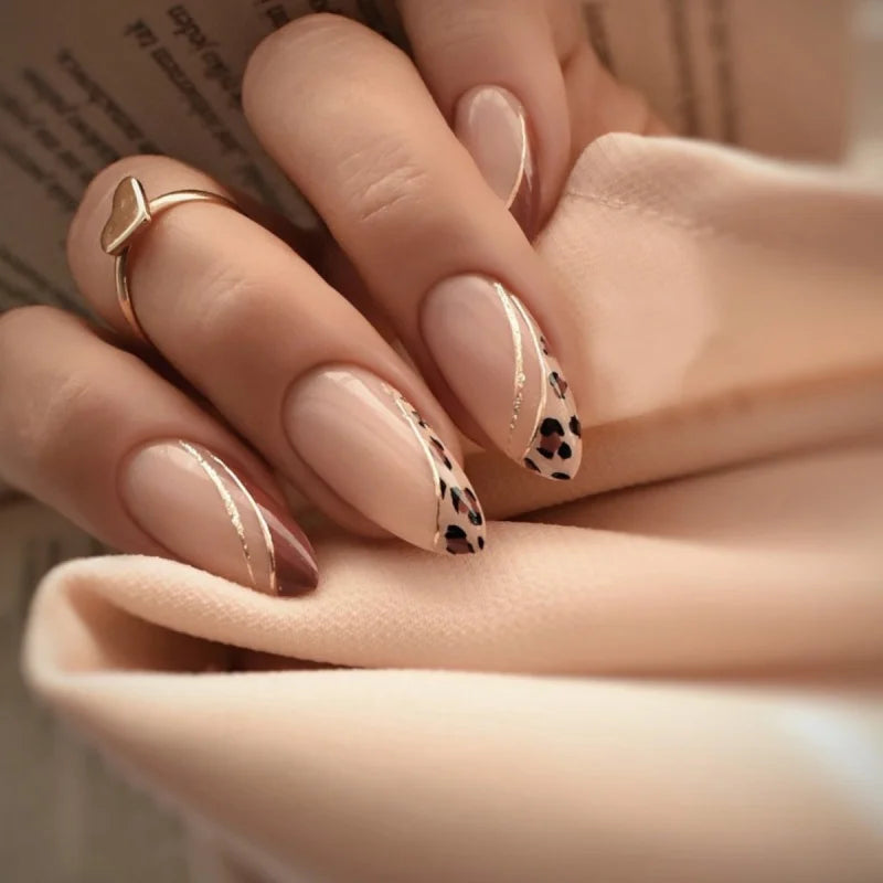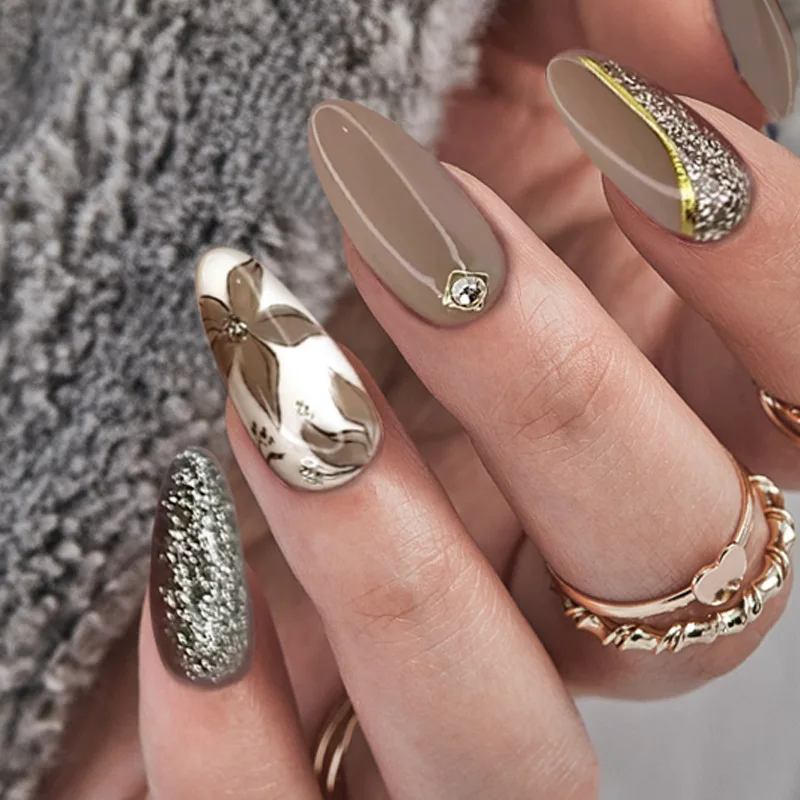 Popxstar 24pcs Fake Nail Gradient Black Almond Full Cover Manicure Datachable False Nail with Jelly Glue Golden Short Press on Nails Sets