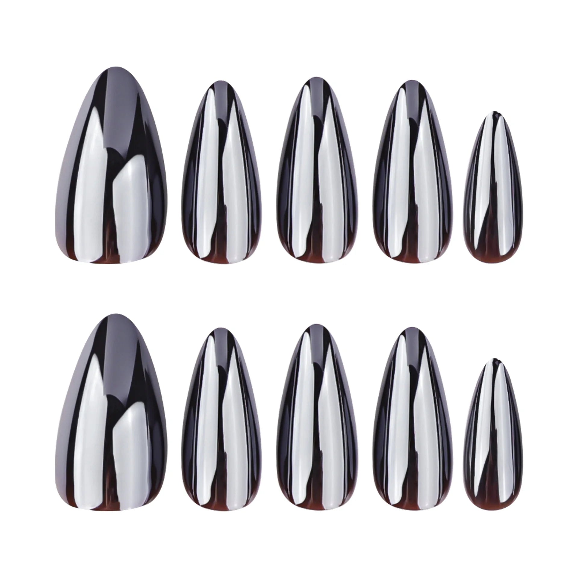 Popxstar 24Pcs Punk Metal Fake Nails Long Almond Press On Nails Black Mirror y2k Nail Tips Full Cover Stiletto False Nails For Girls