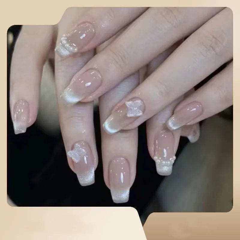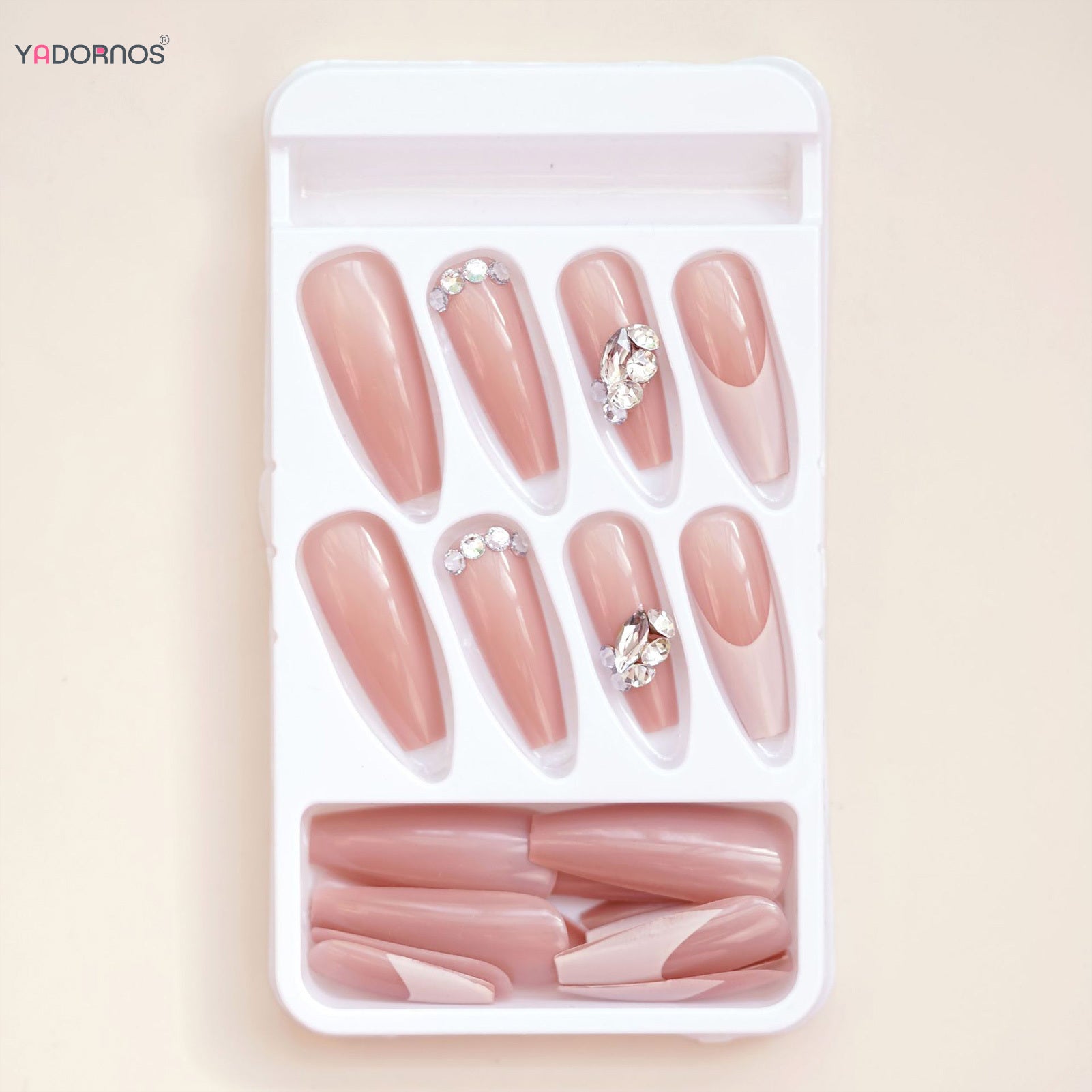 Popxstar French Fake Nails Stick-on Long Ballet Pink False Nails with Rhinestone Designs Full Cover Acrylic Press on Nails for Women Girl