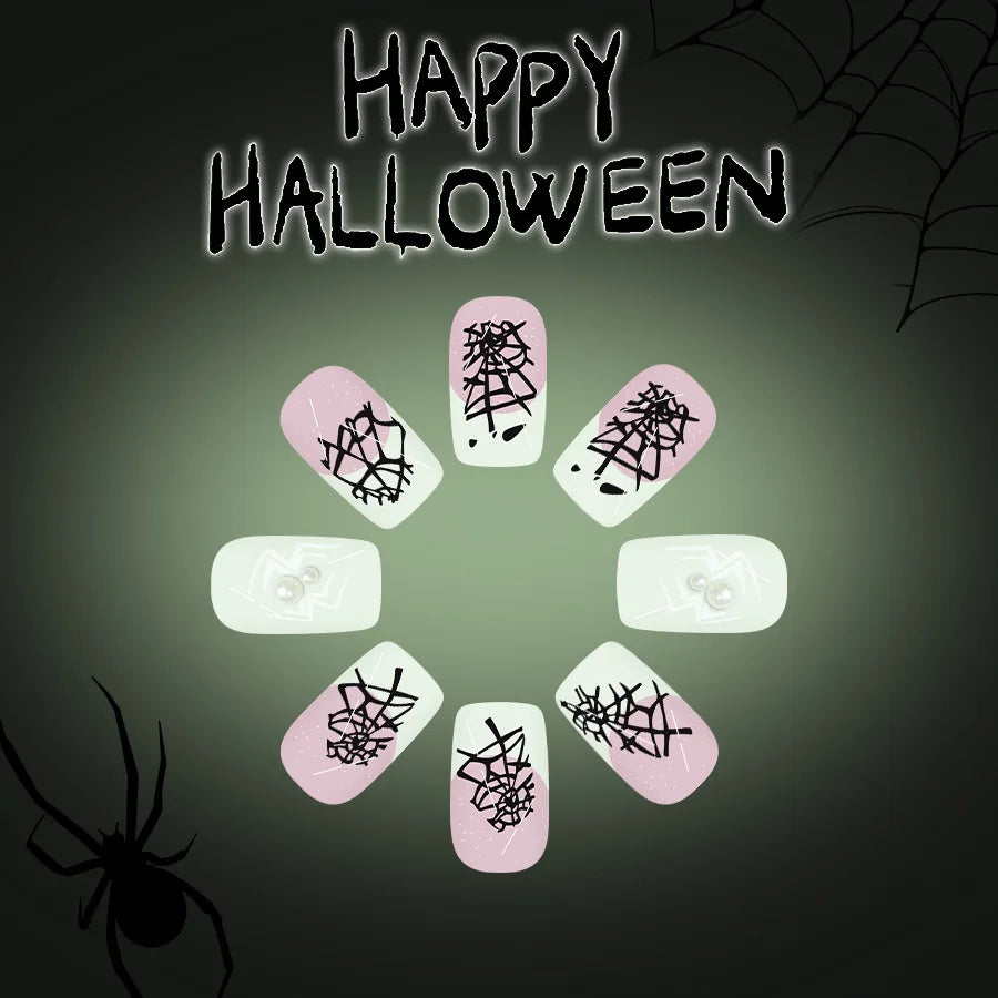 Popxstar Halloween Nails Press On 24Pcs Short Oval Shaped Fake Nails White Ghost/Flower/Bat/Spider/Web/Pumpkin Designs False Nails Art