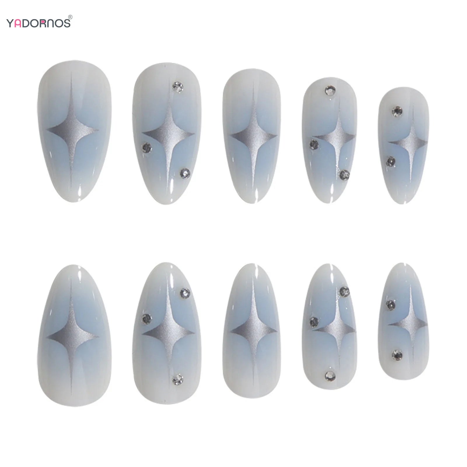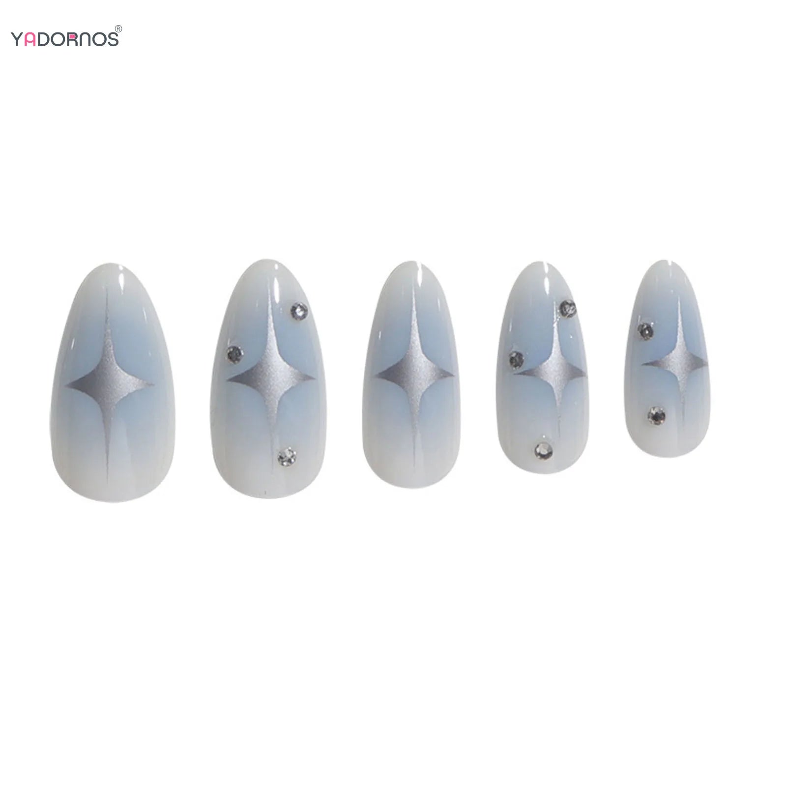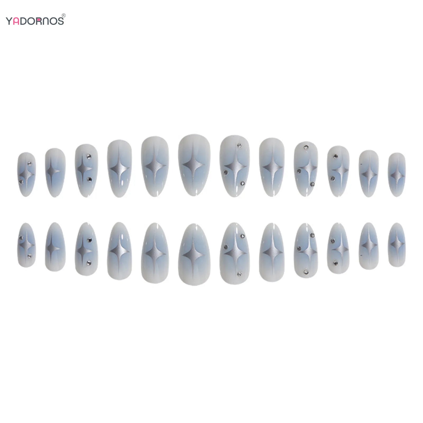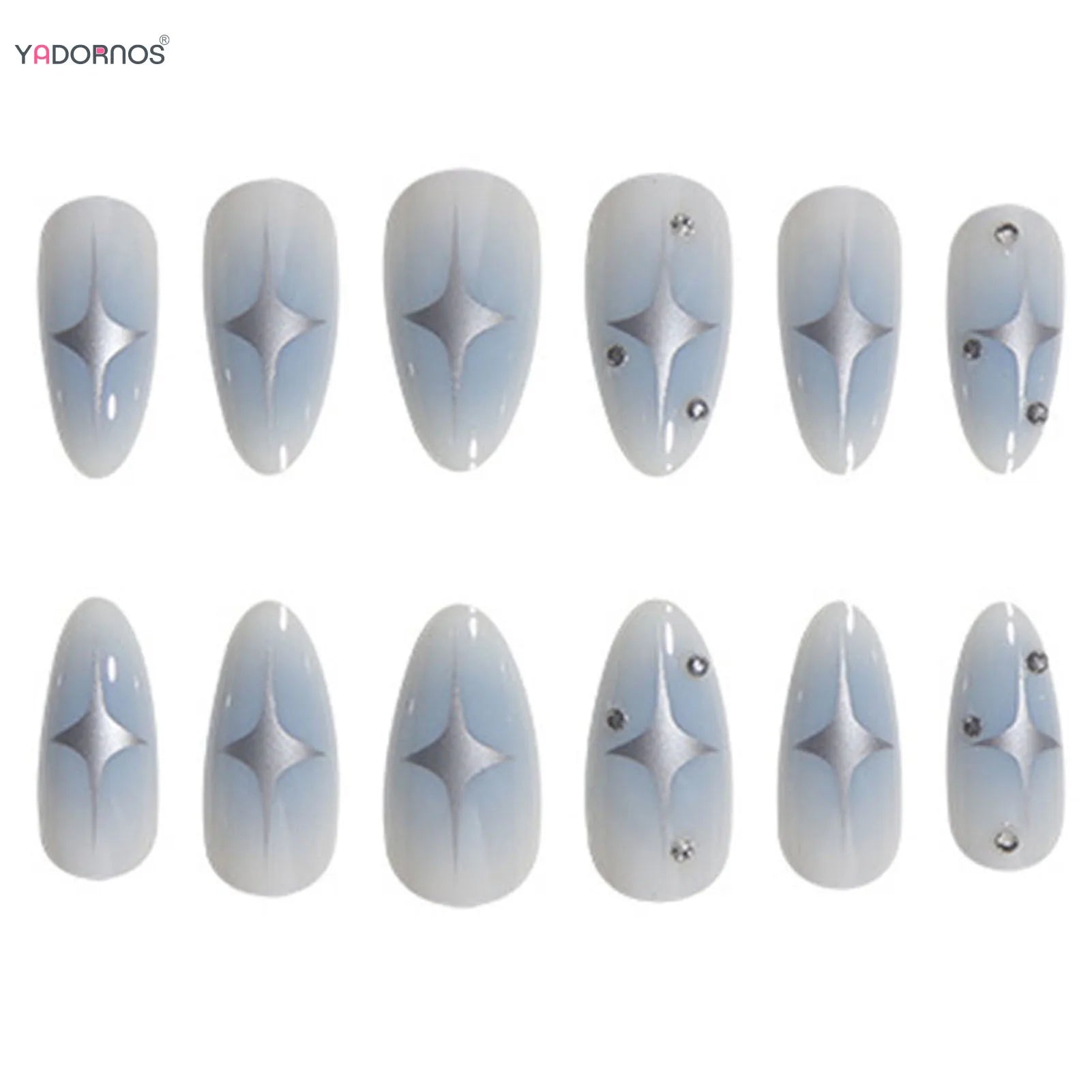 Popxstar Y2K Girls Almond Fake Nails Gradient Blue Press on Nail Star Printed Full Cover Wearable False Nails Tips for Women DIY Manicure
