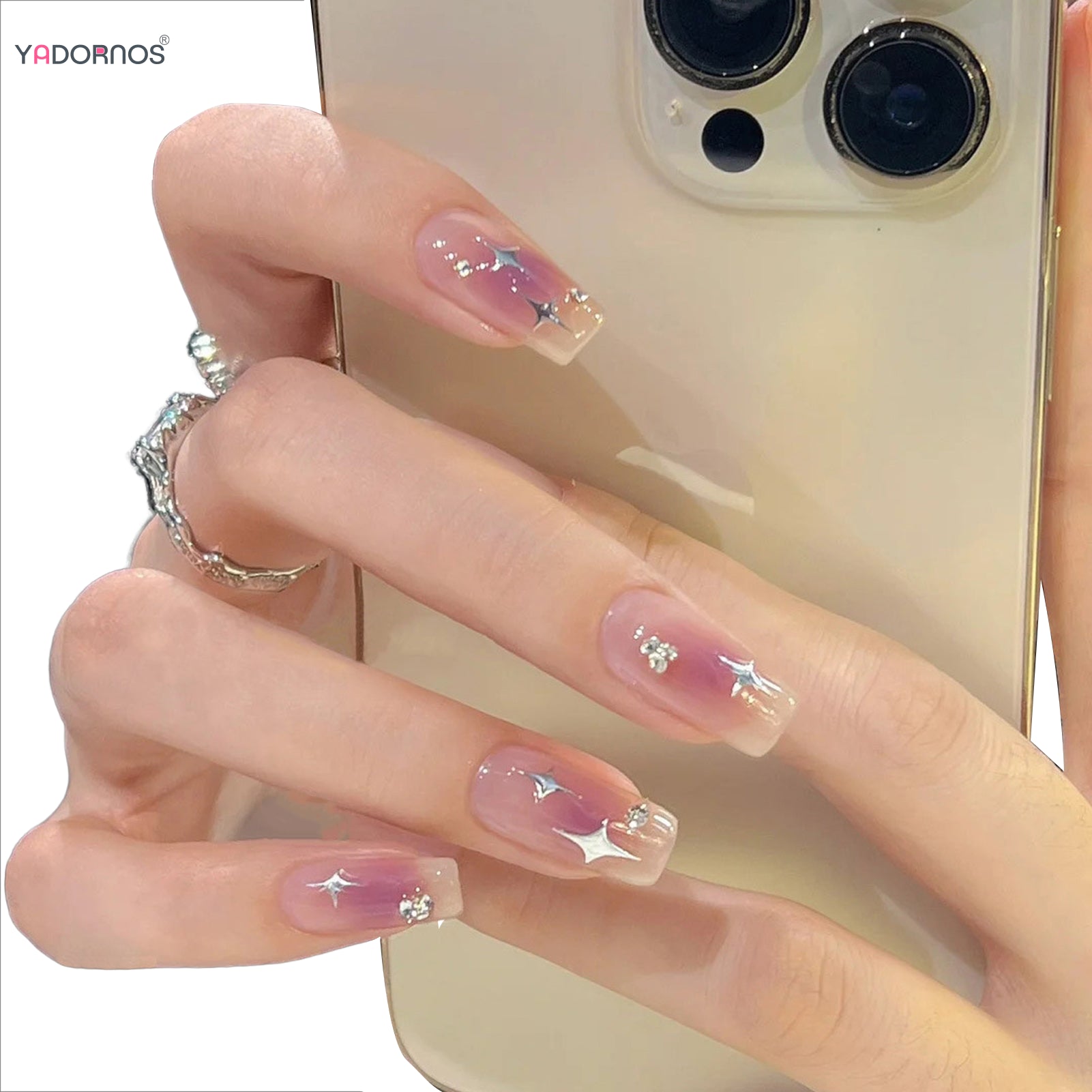 Popxstar Y2K Style Fake Nails with Silver Star Designs Gradient Purple Press on Nails Medium Length Ballet False Nails for Women Party