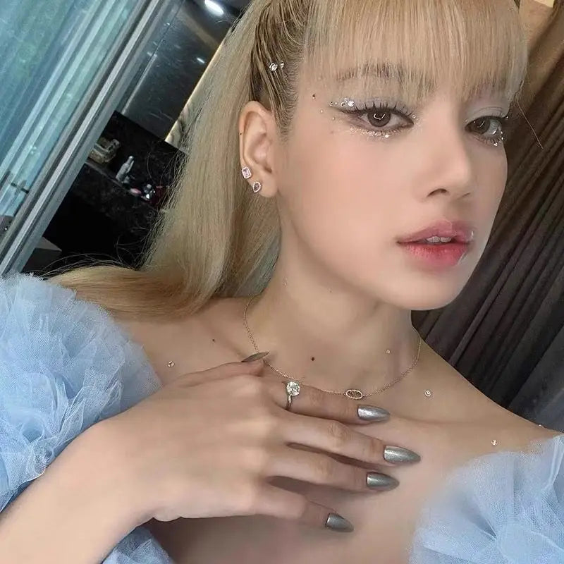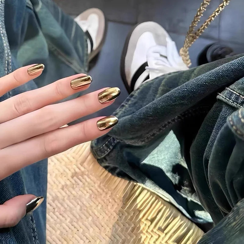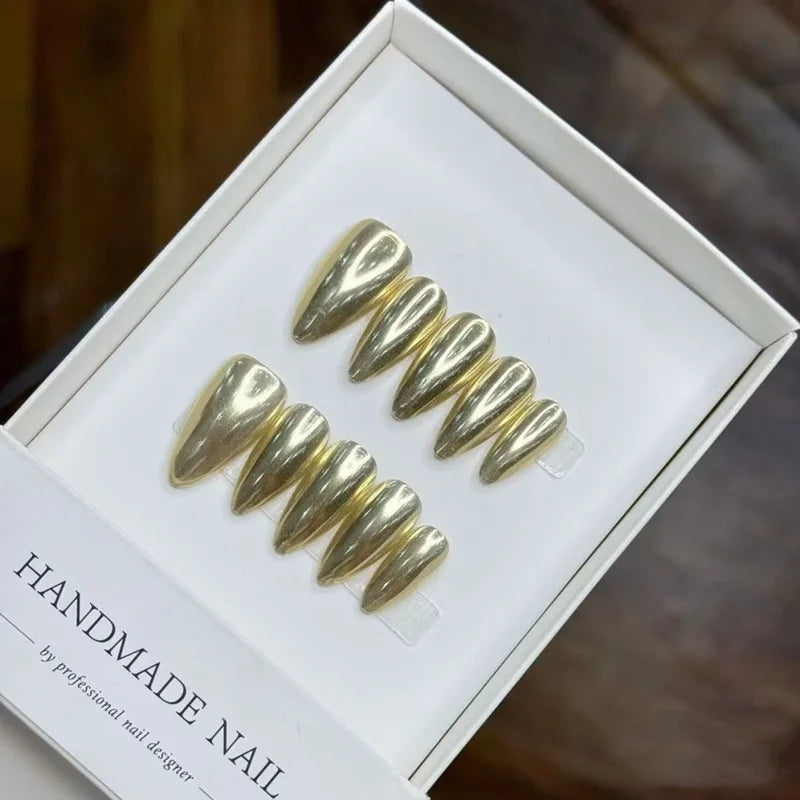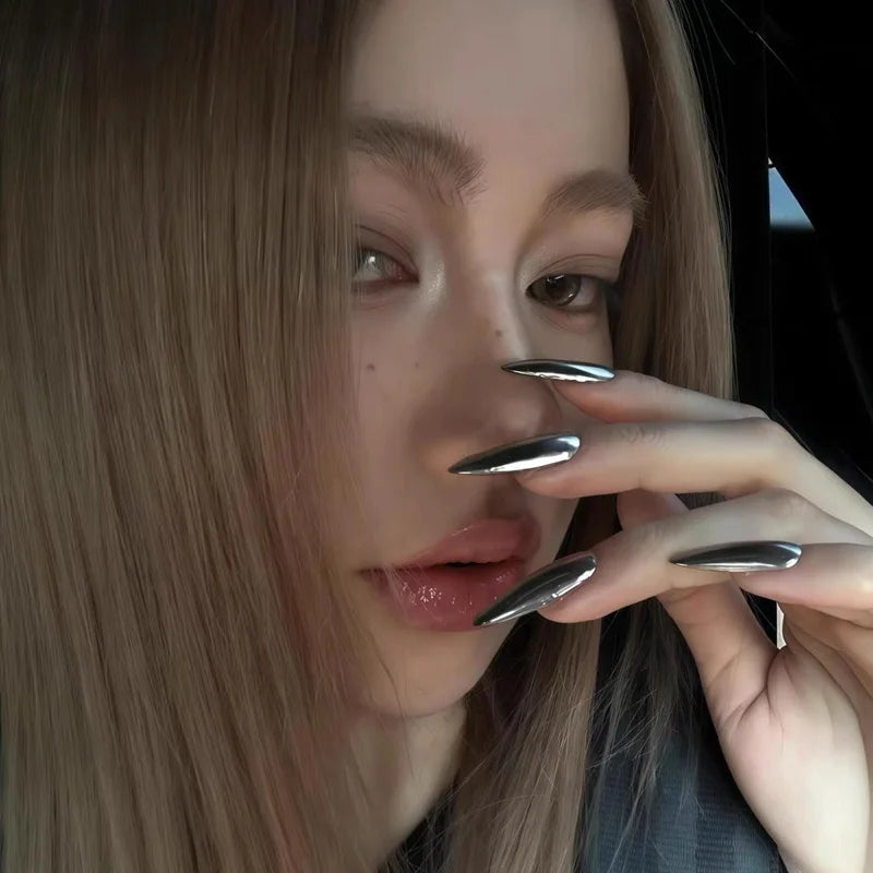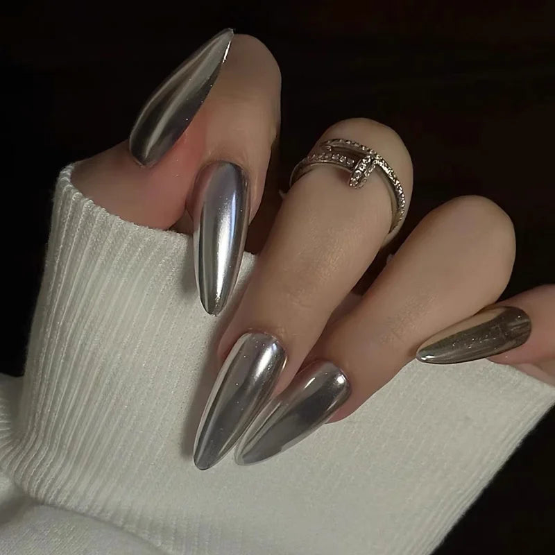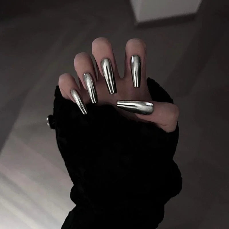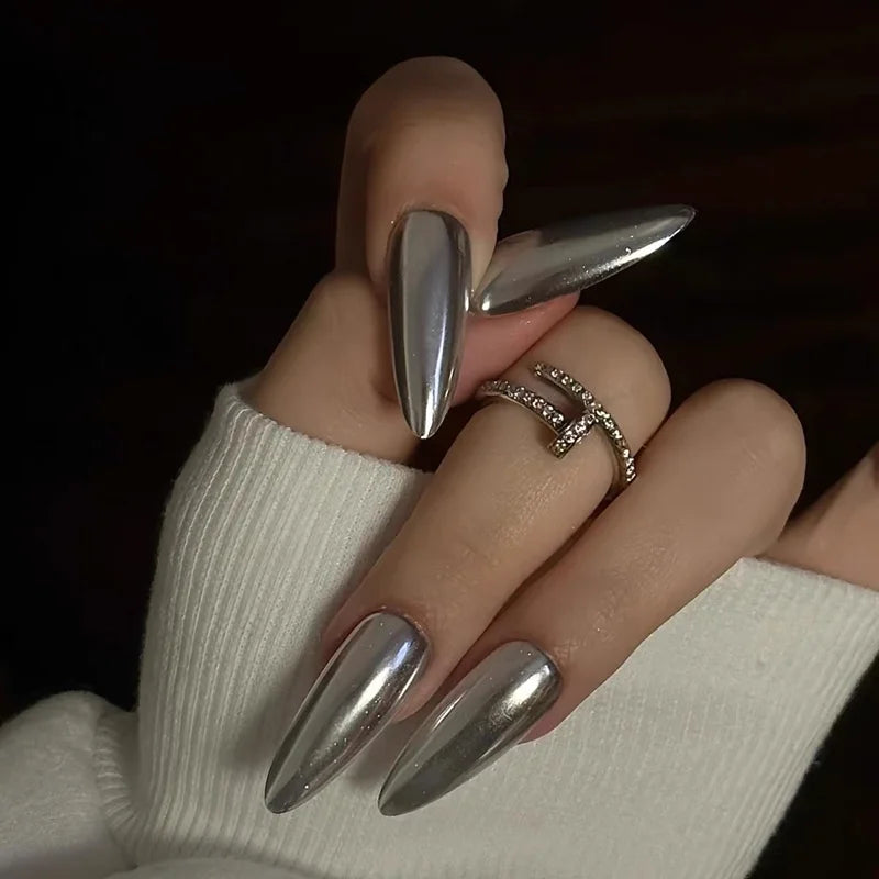 Popxstar 10PCS Metal Handmade Press on Nails Acrylic Magic Full Cover Fake Nails Reusable Adhesive Silver Artificial Cool Manicure Art