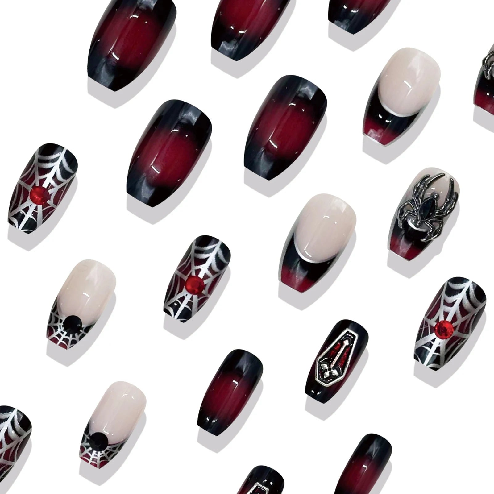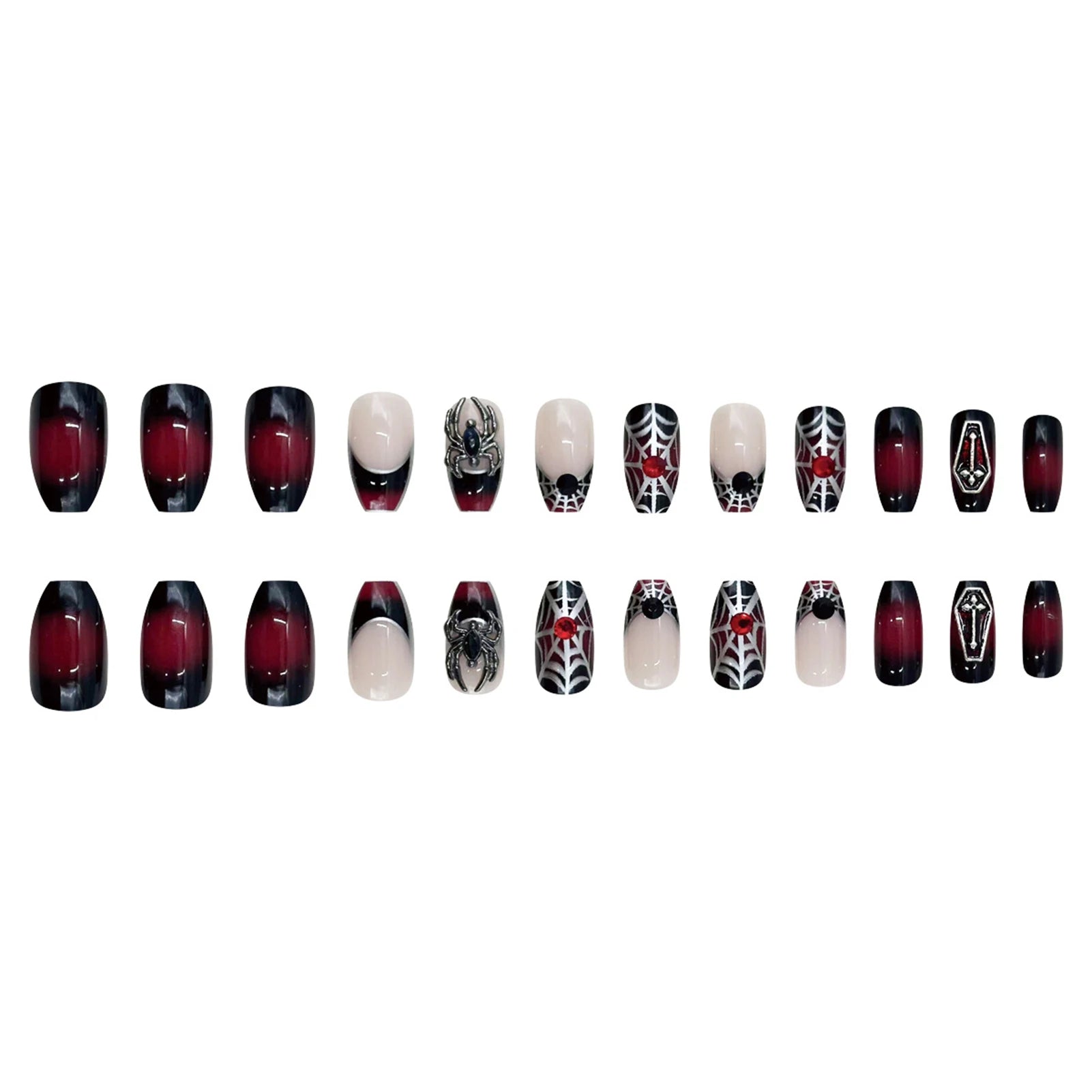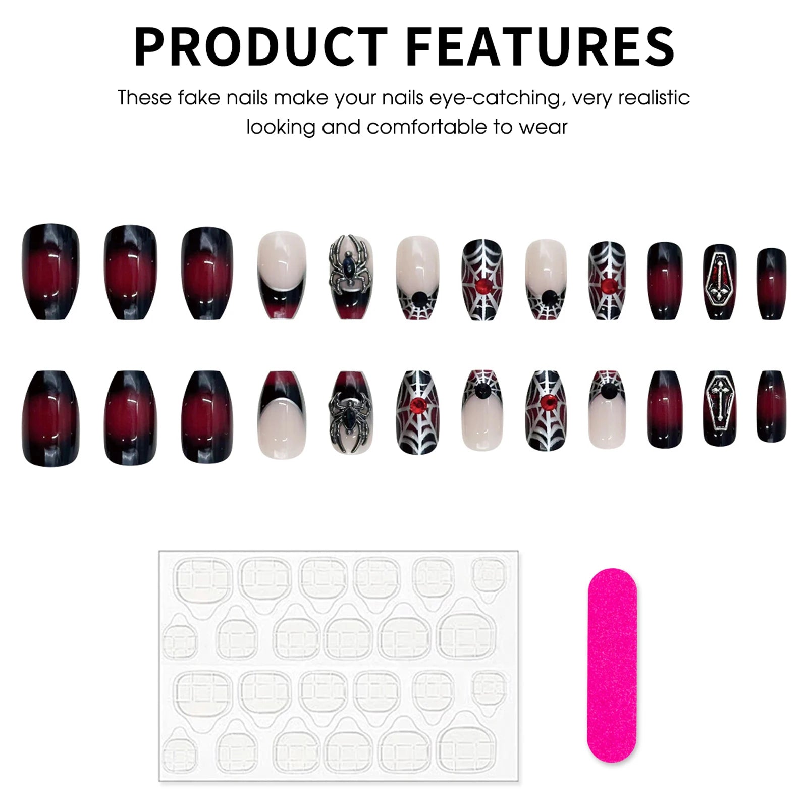 Popxstar Red/Black Fake Nails 24Pcs Halloween Nails Press On Short Square French False Nails Patches Alloy Spider Designs for Party