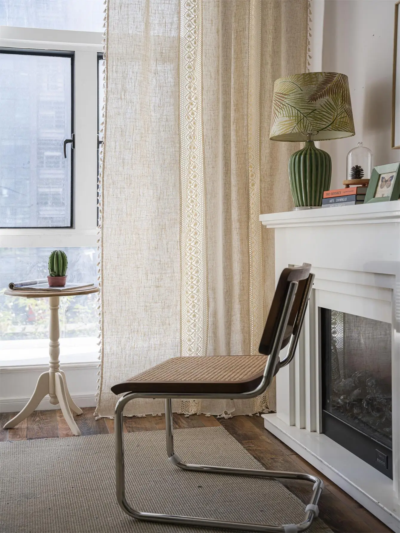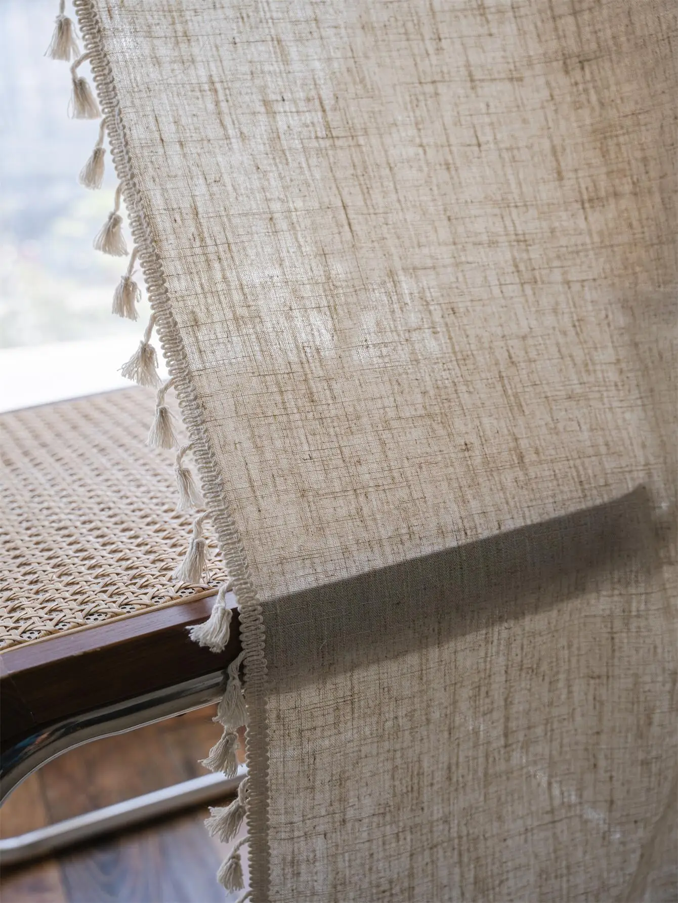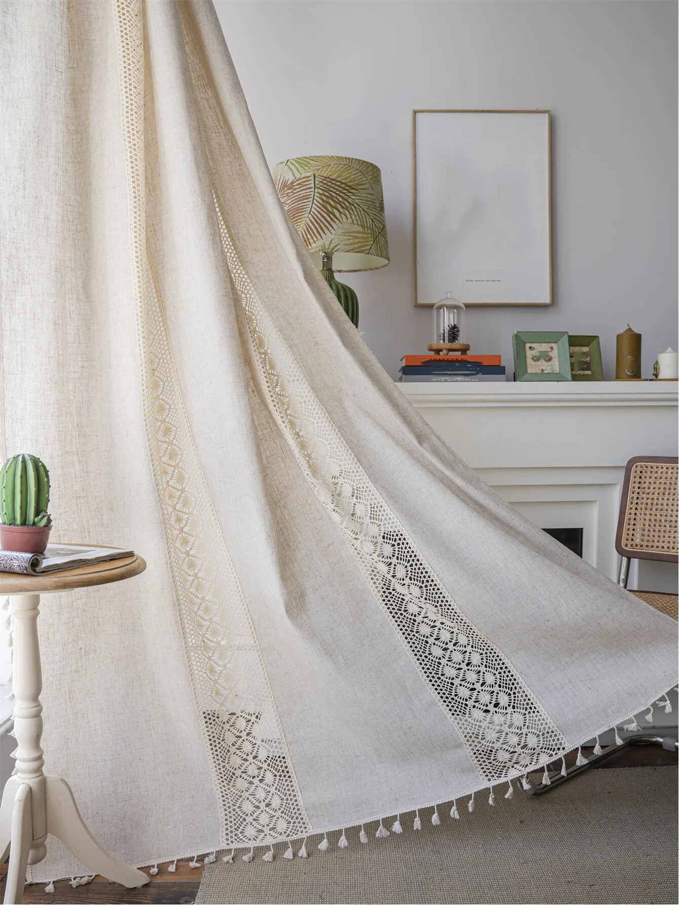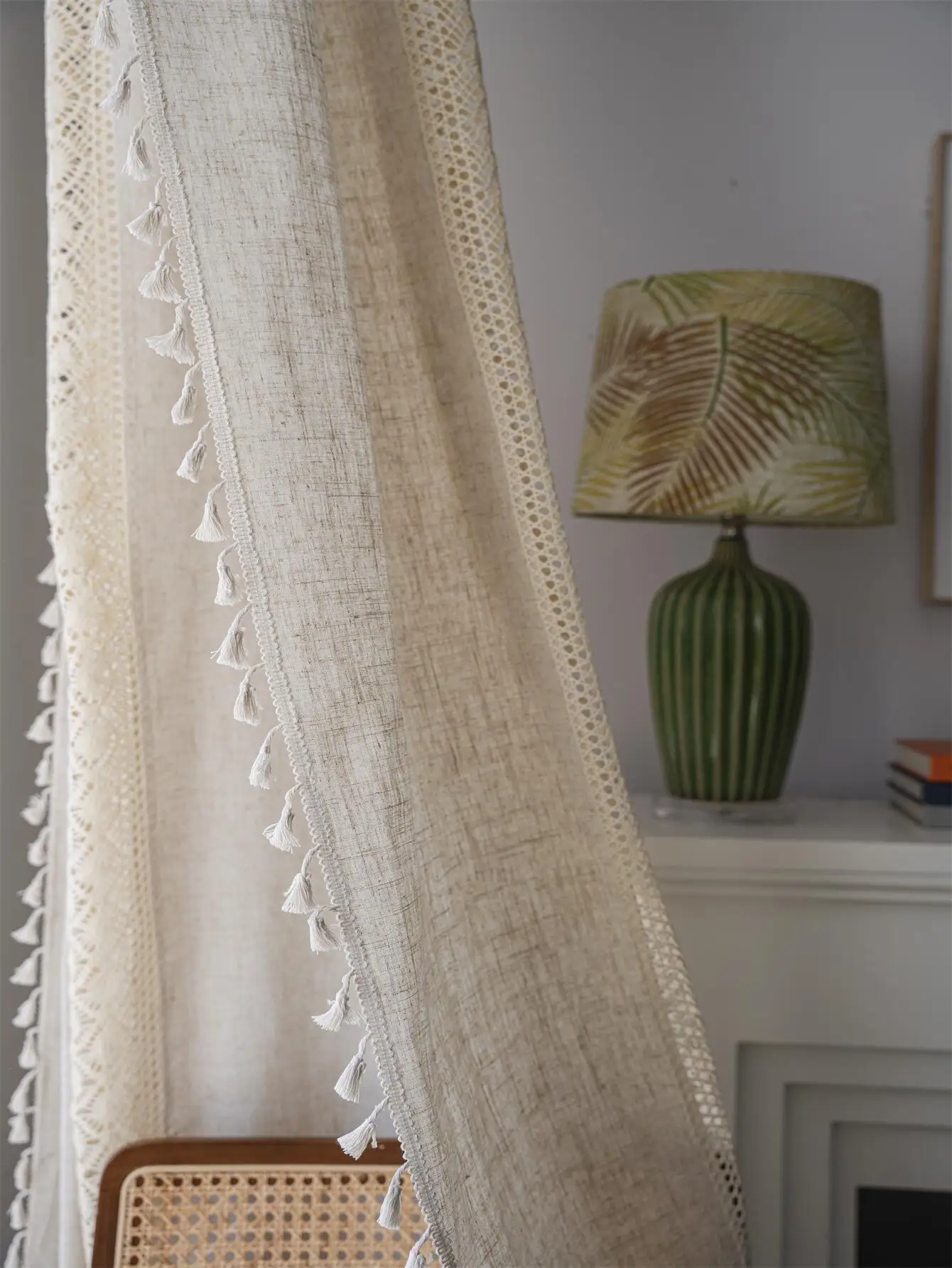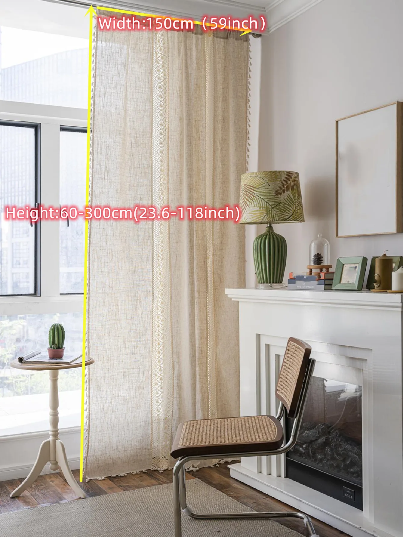 Popxstar Micro transparent Bohemian hollow crochet pure linen hand-stitched beige fringed farmhouse retro decorative curtains 1PC