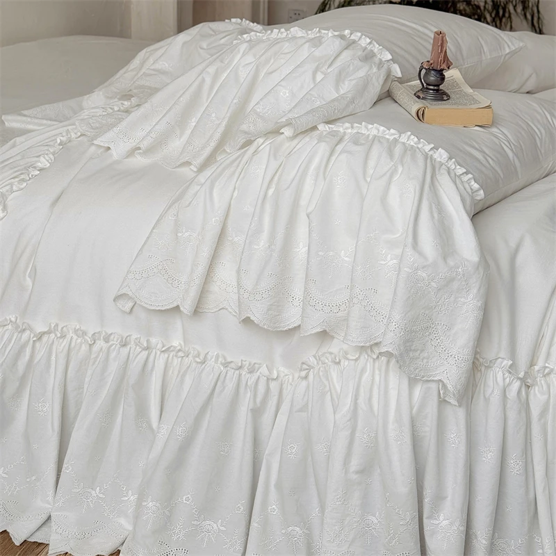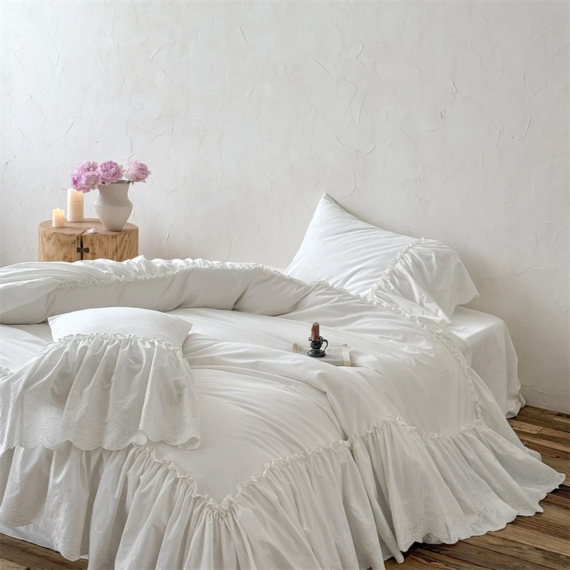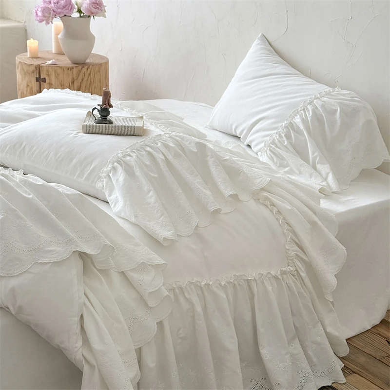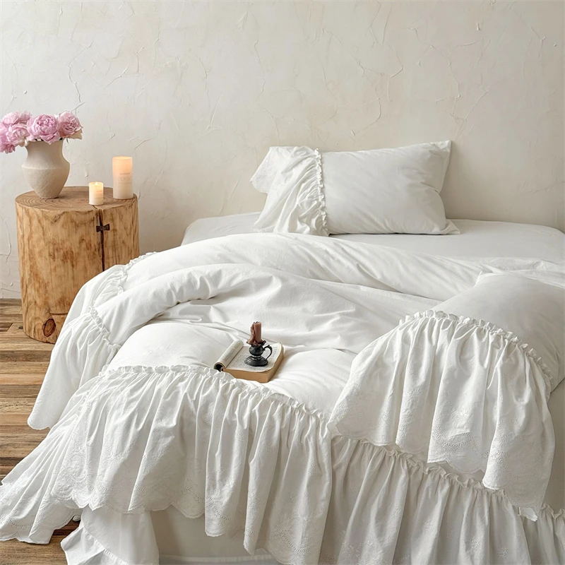 Popxstar 100% Cotton White Pleated Ruffles Princess Wedding Bedding Set Washed Cotton Duvet Cover Flat/Fitted Bed Sheet Pillowcases 4Pcs