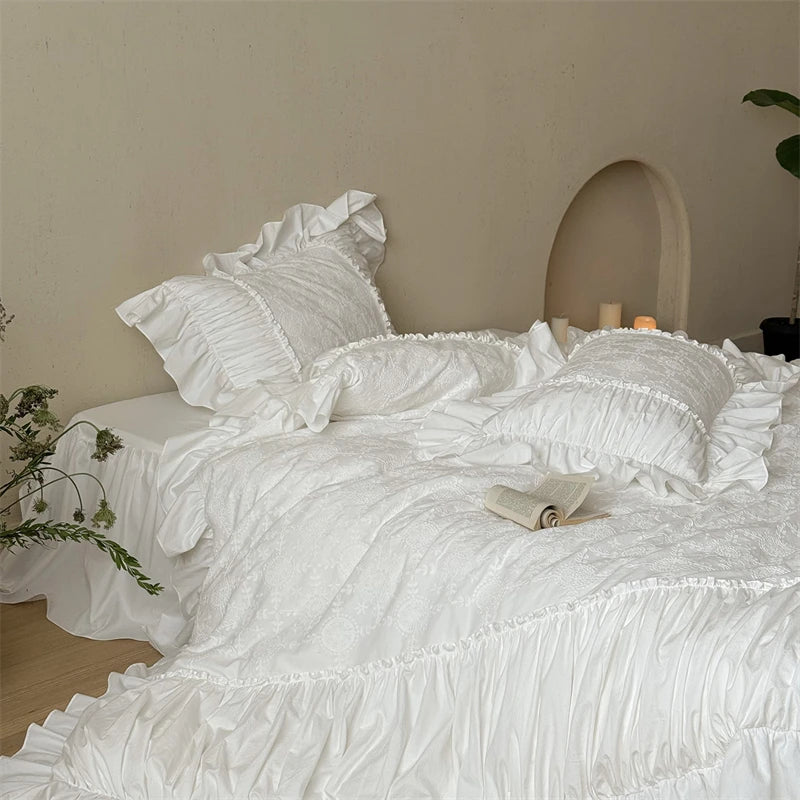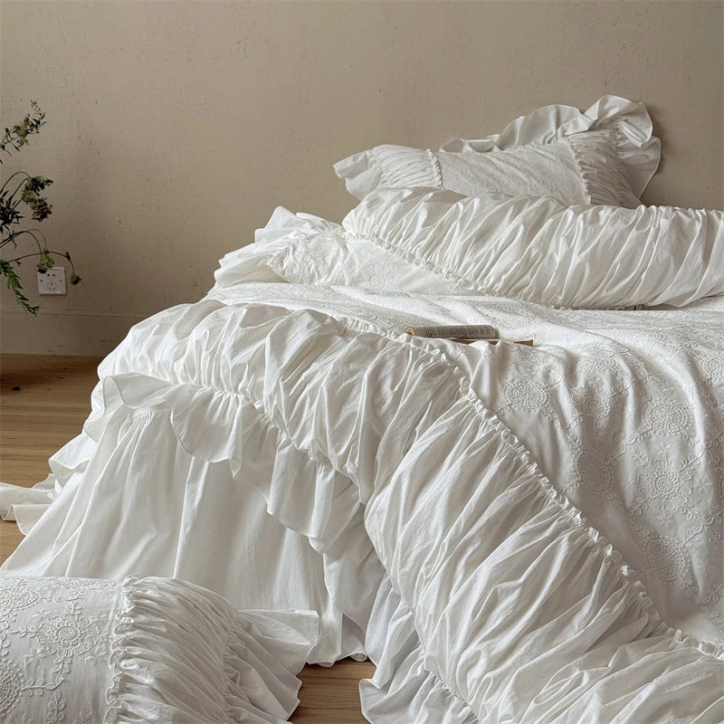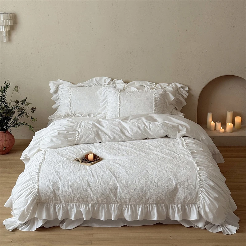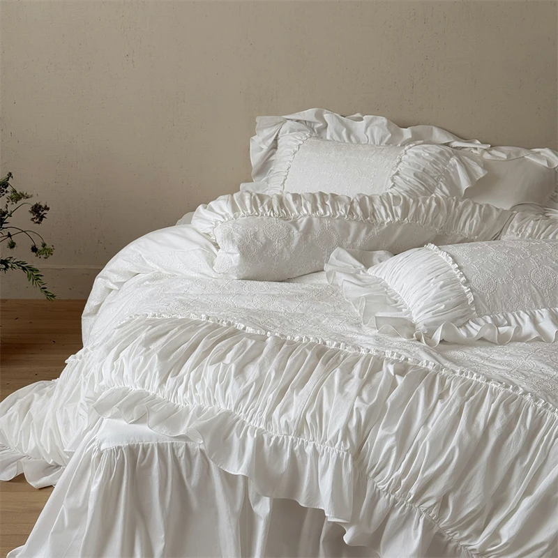 Popxstar 100% Cotton White Vintage French Princess Wedding Bedding Set Washed Cotton Pleated Ruffle Duvet Cover Bed Skirt Pillowcase 4Pcs
