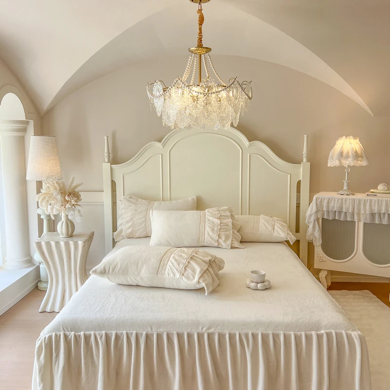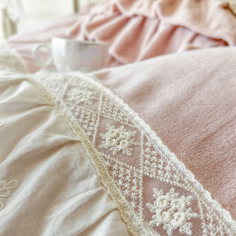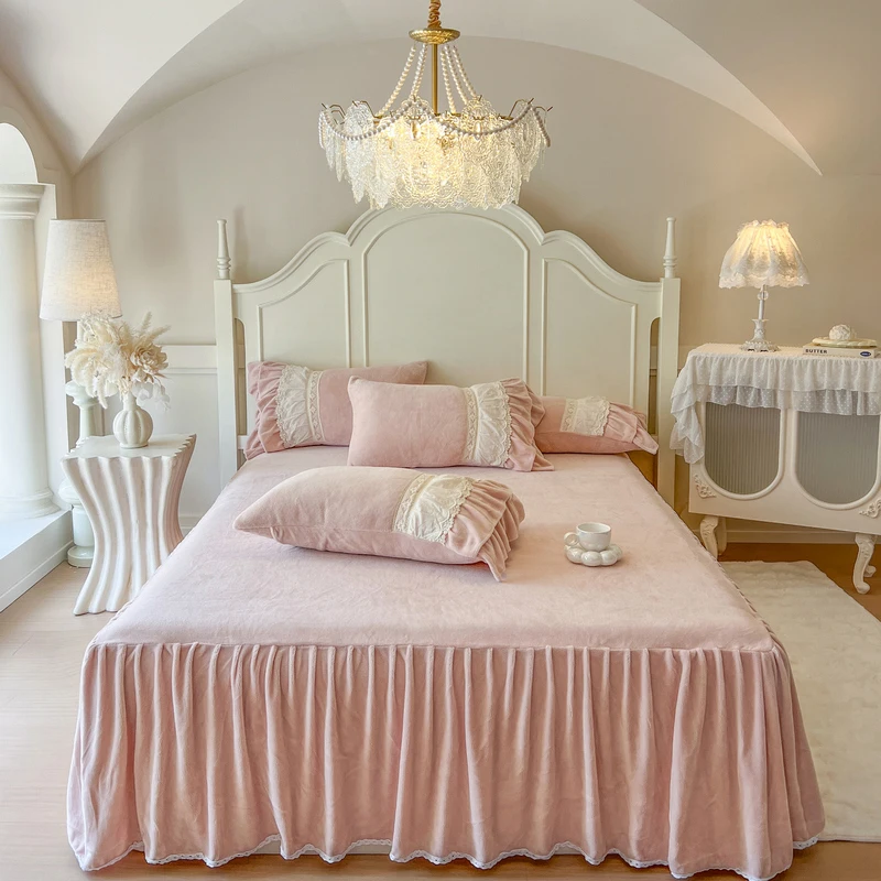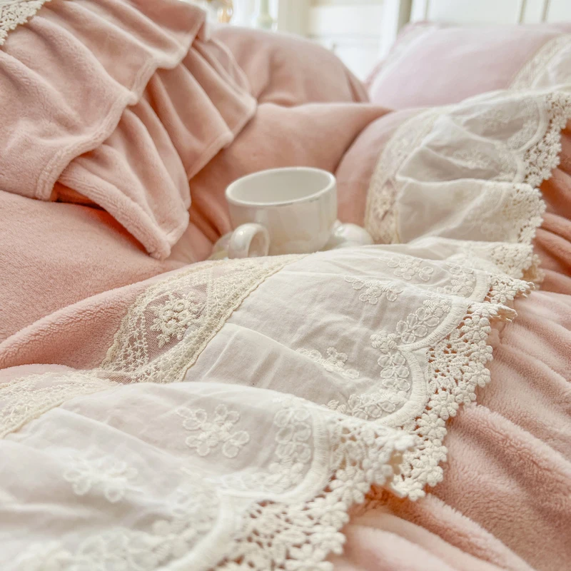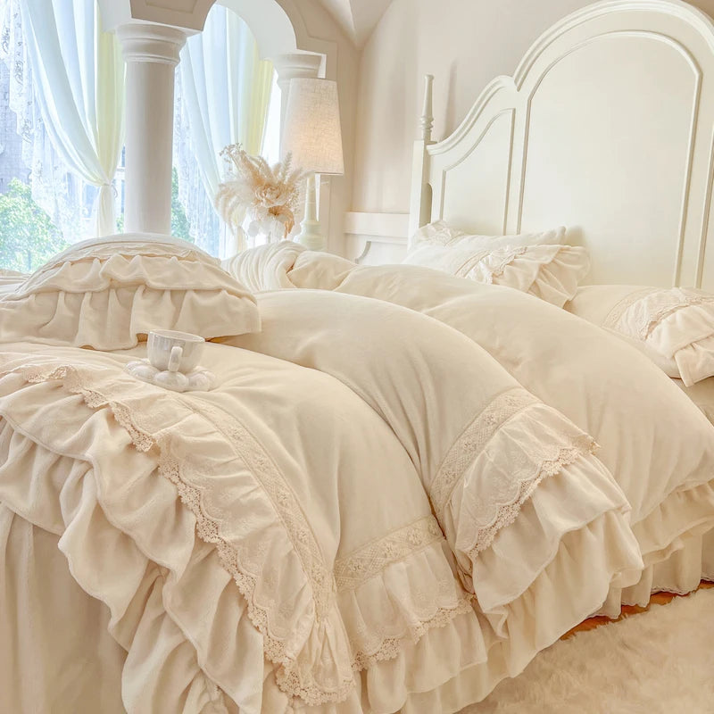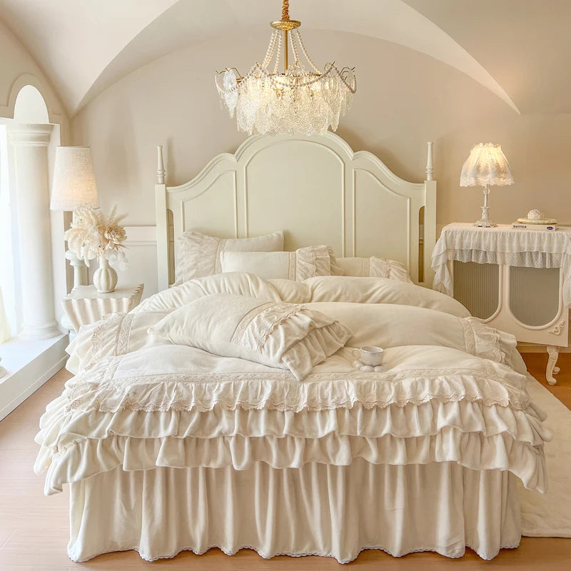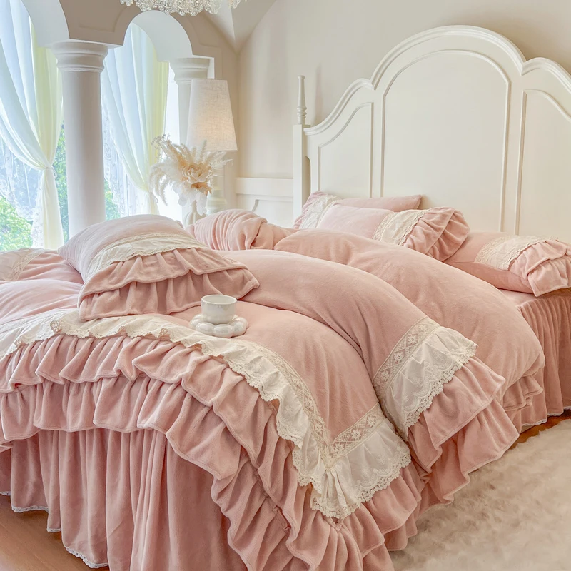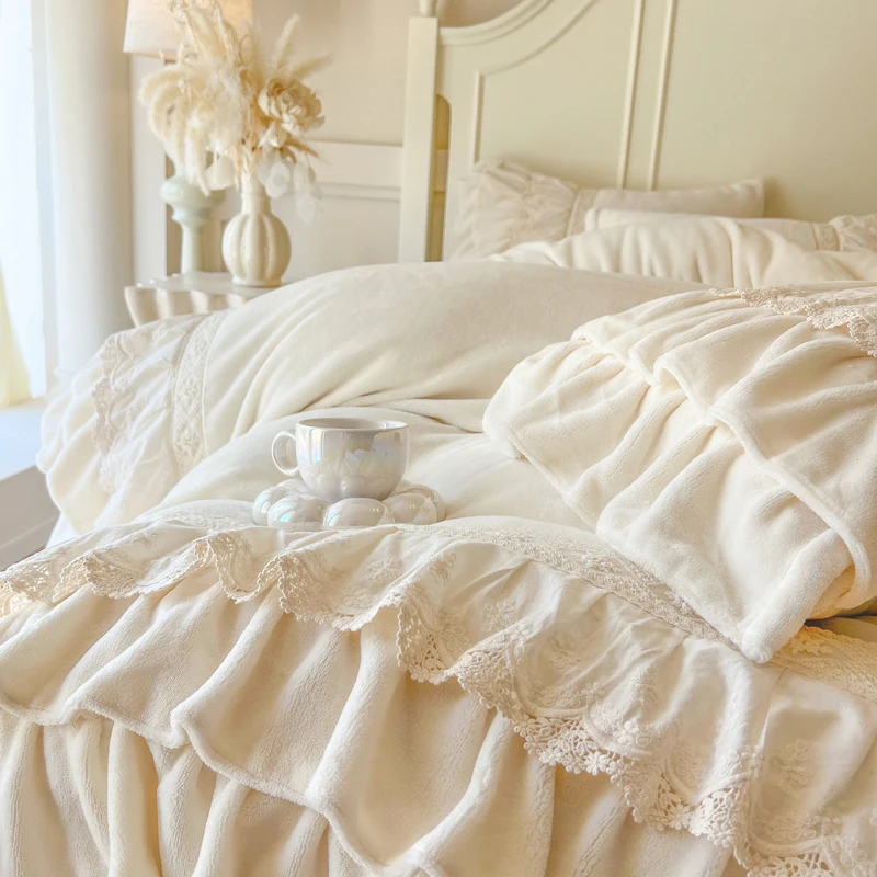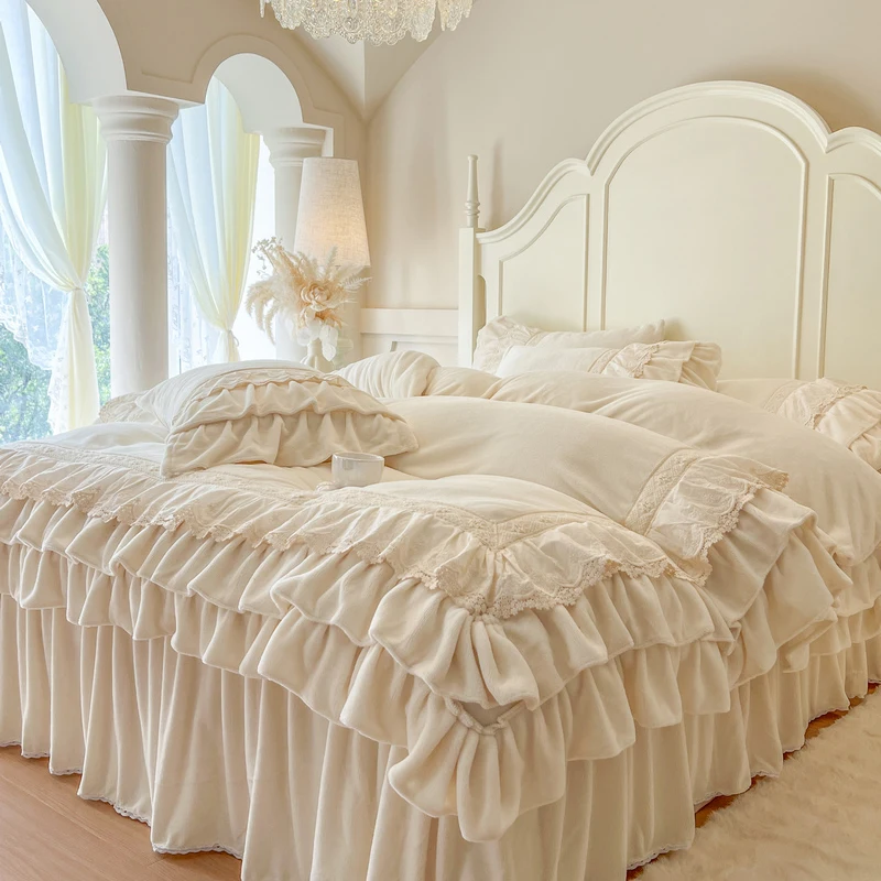 Popxstar Romantic Three Layer Lace Ruffles Velvet Winter Warm Thickened Princess Bedding Set Duvet Cover Bed Skirt Pillowcases 4Pcs
