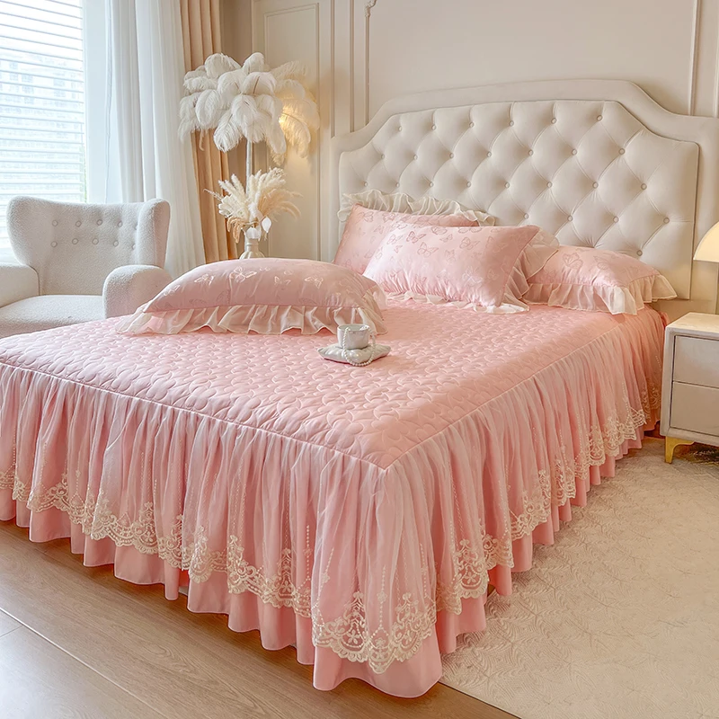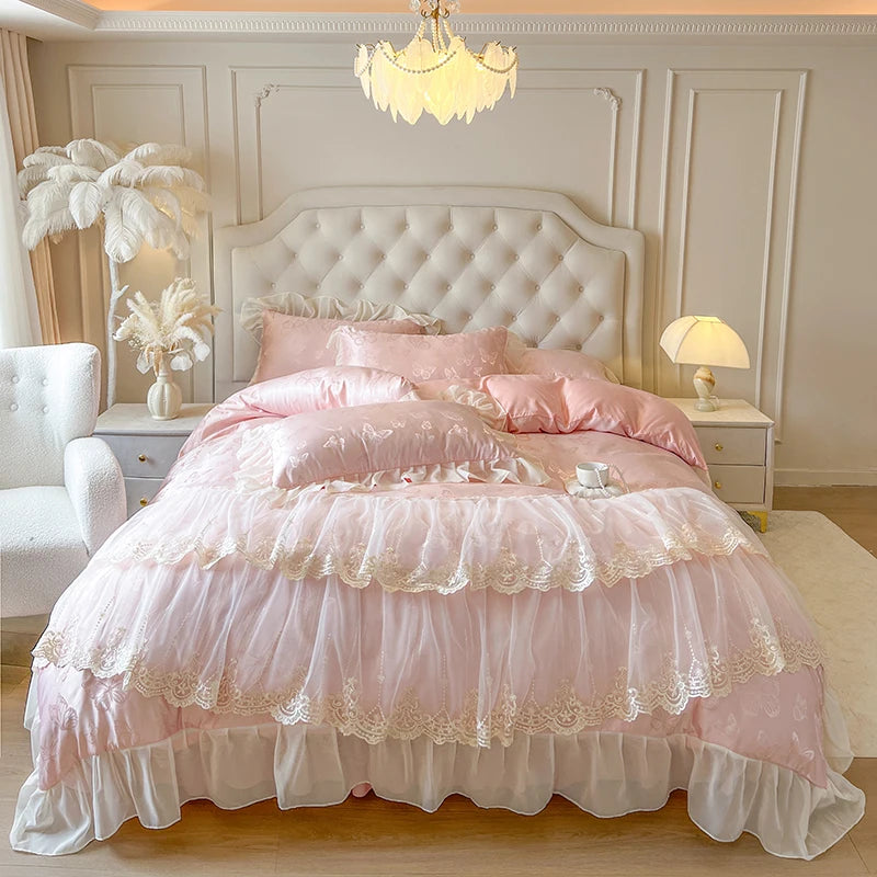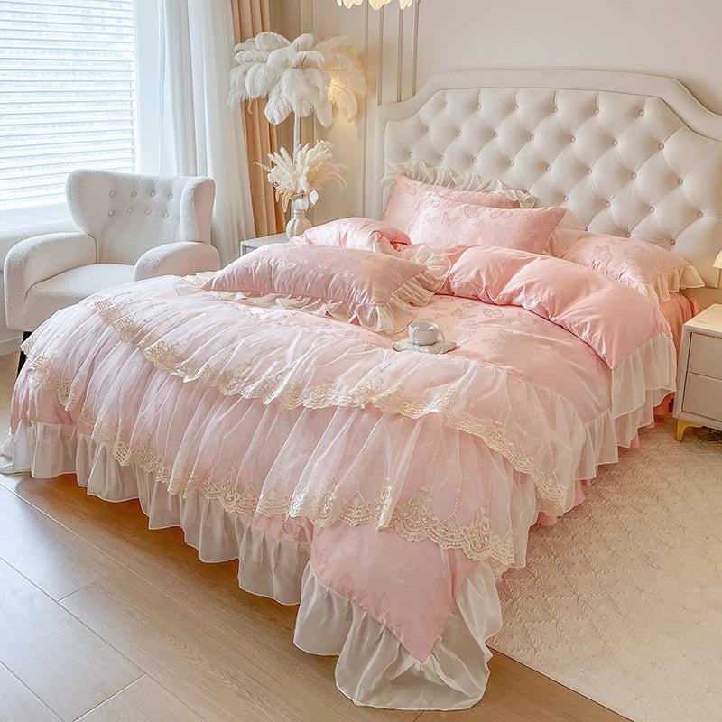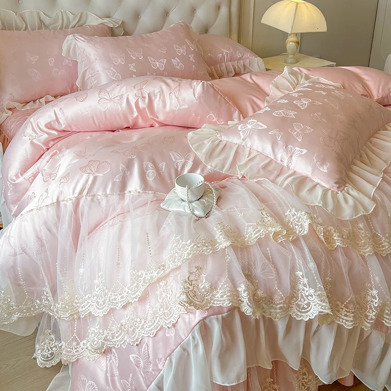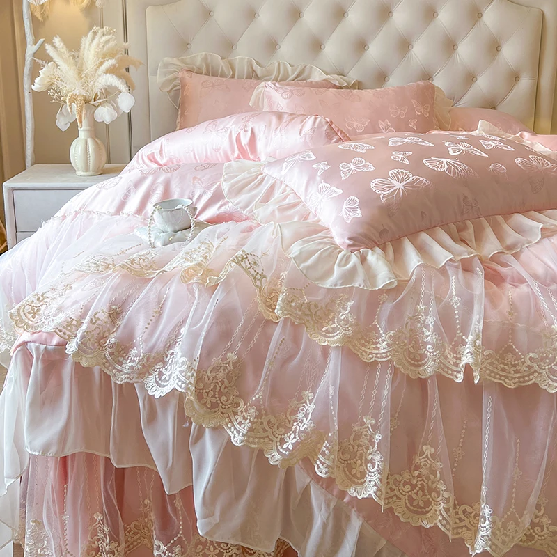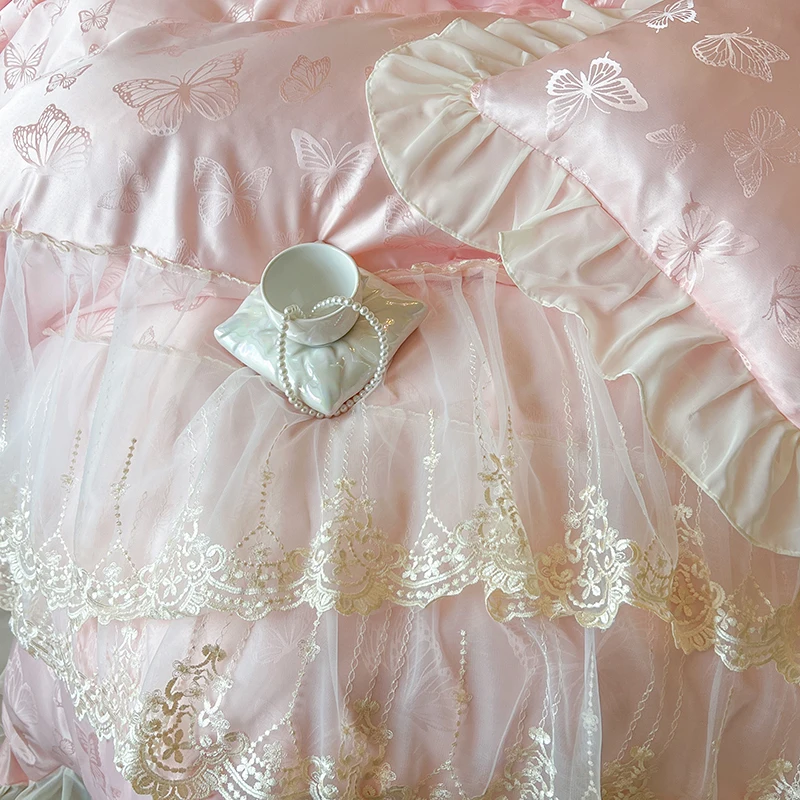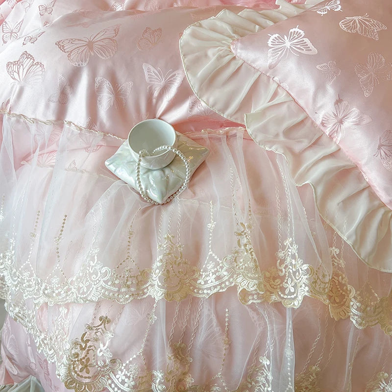 Popxstar 4/6Pcs Pink Butterfly Jacquard Three-layer Lace Ruffles Princess Wedding Bedding Set Duvet Cover Bed Skirt Bedspread Pillowcases