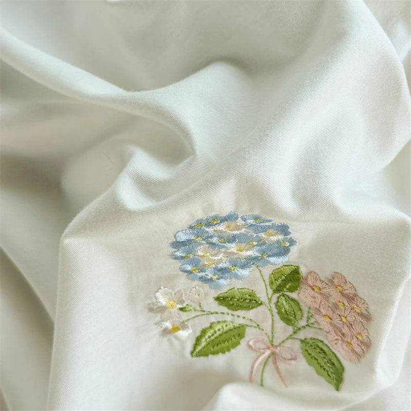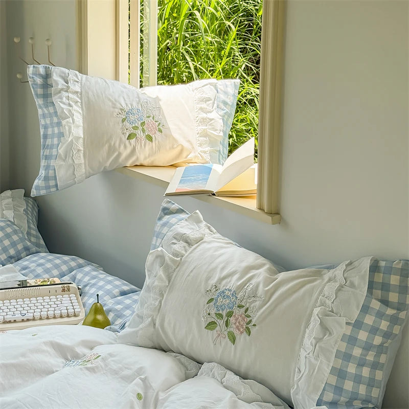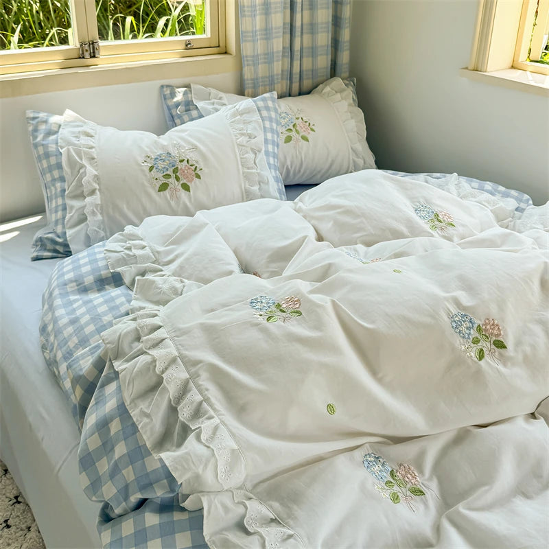 Popxstar Korean Princess Style Double Layer Lace Flower Embroidery 100% Cotton Bedding Set Plaid Style Duvet Covers Bed Sheet Pillowcases