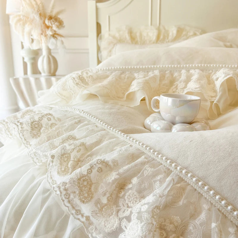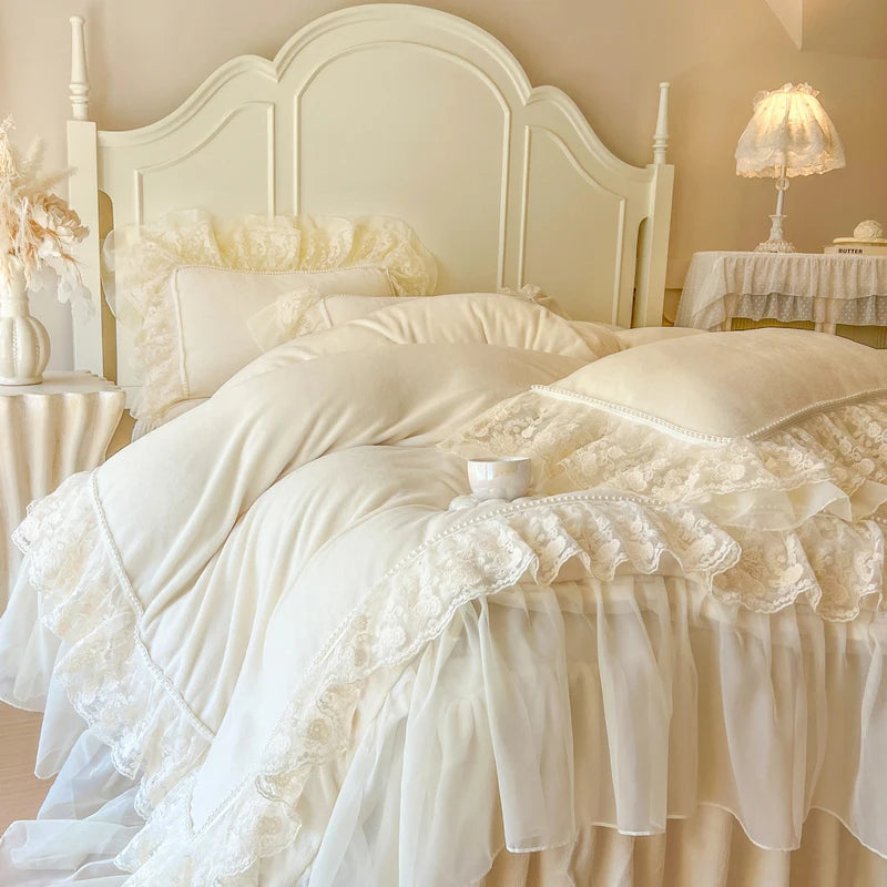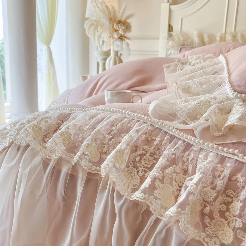 Popxstar  Romantic Lace Ruffles Handmade Beads Velvet Winter Warm Thickened Princess Bedding Set Duvet Cover Bed Skirt Pillowcases 4Pcs