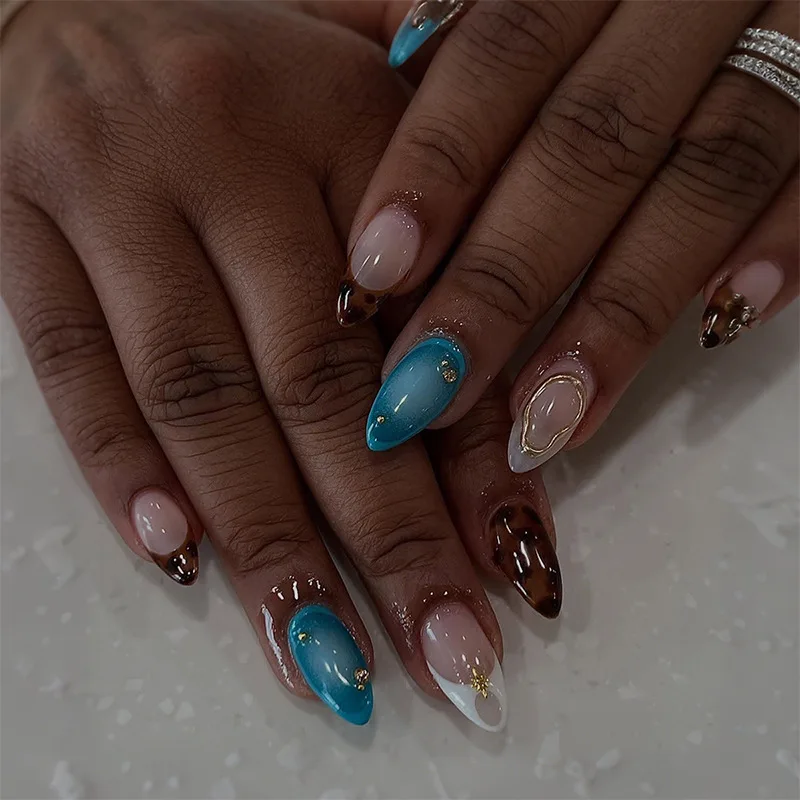 Popxstar  24pcs Leopard Print French Fake Nails Tips Yellow Short Oval False Nail Art Wearable Flower Almond Press on Nails Sets Finished