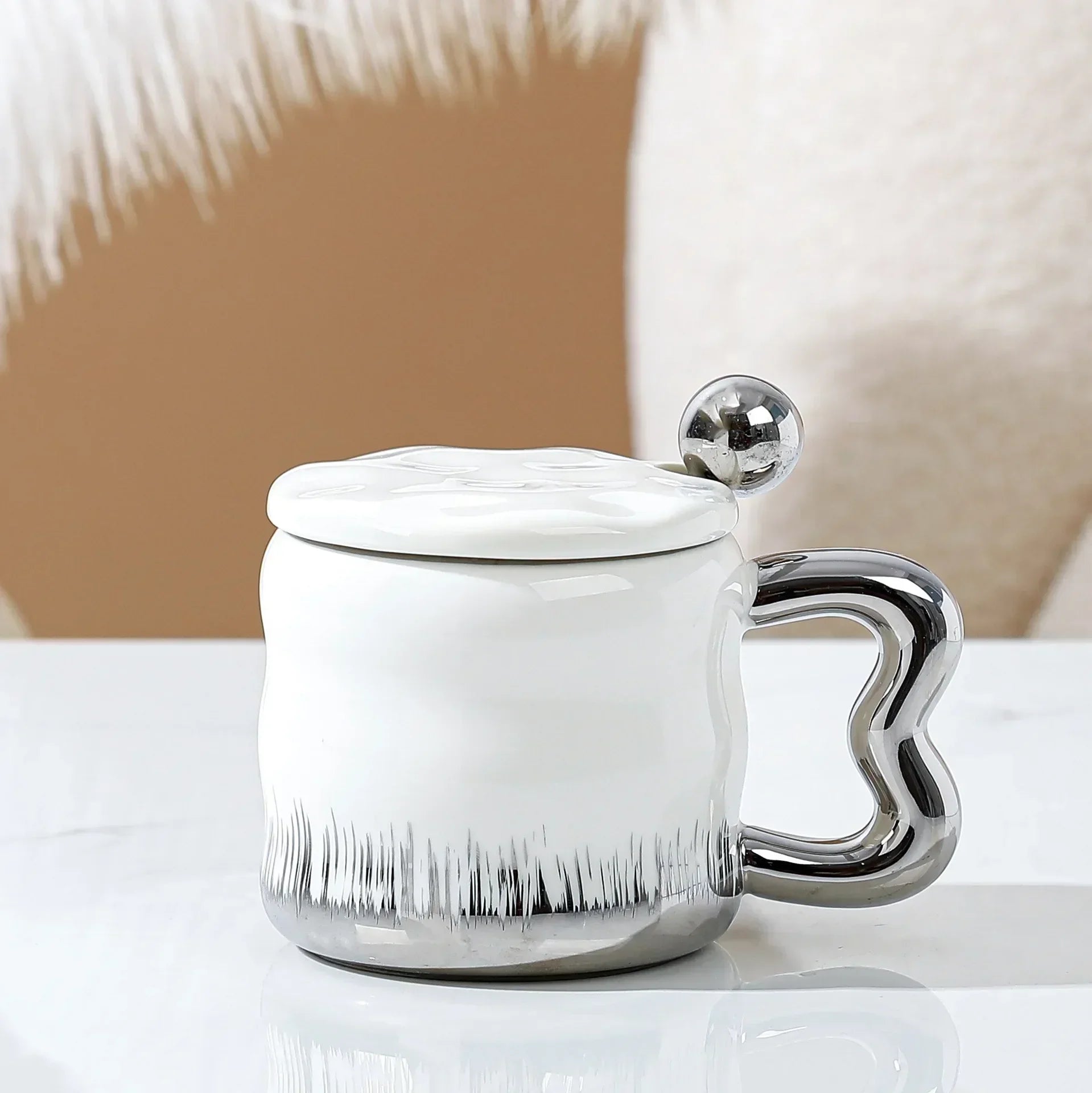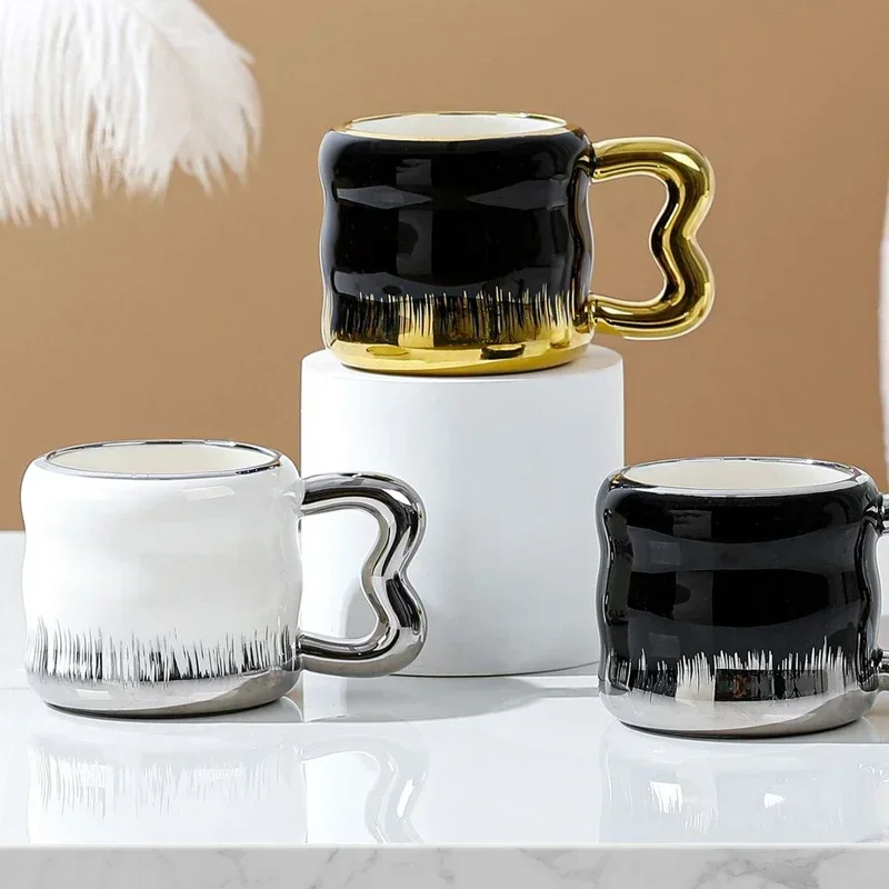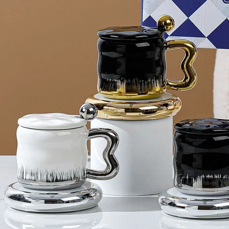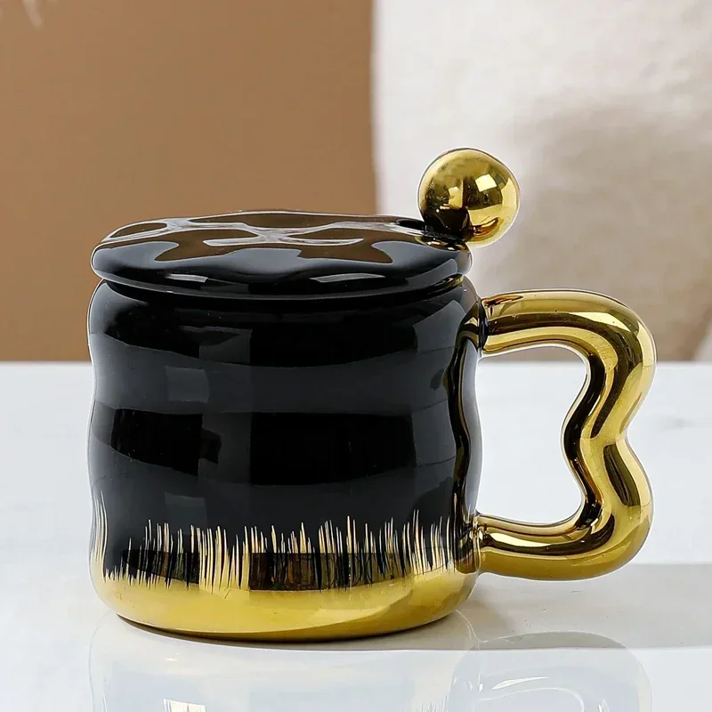 Popxstar Light Luxury Mug with Lid Spoon Electroplated Golden Cup Water Cups Ceramic Breakfast Mug Creative Coffee Cup Milk Cup Girl Gift