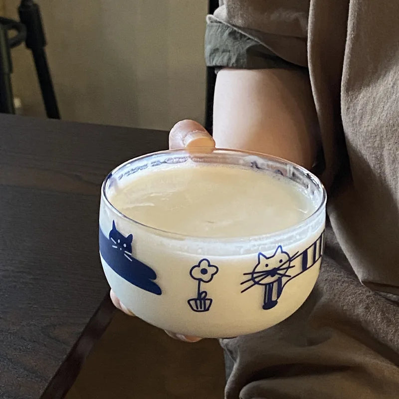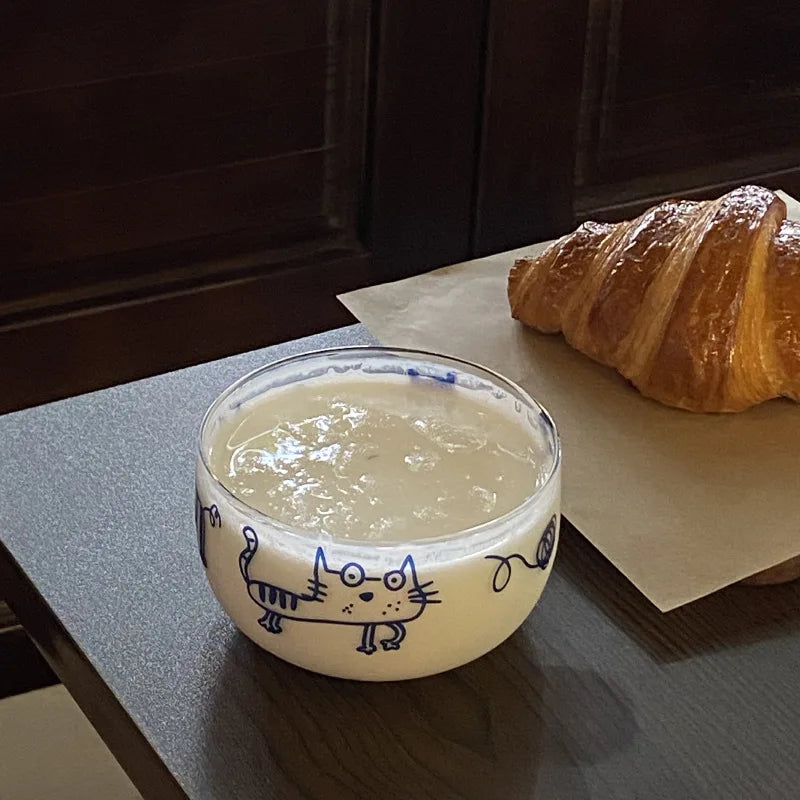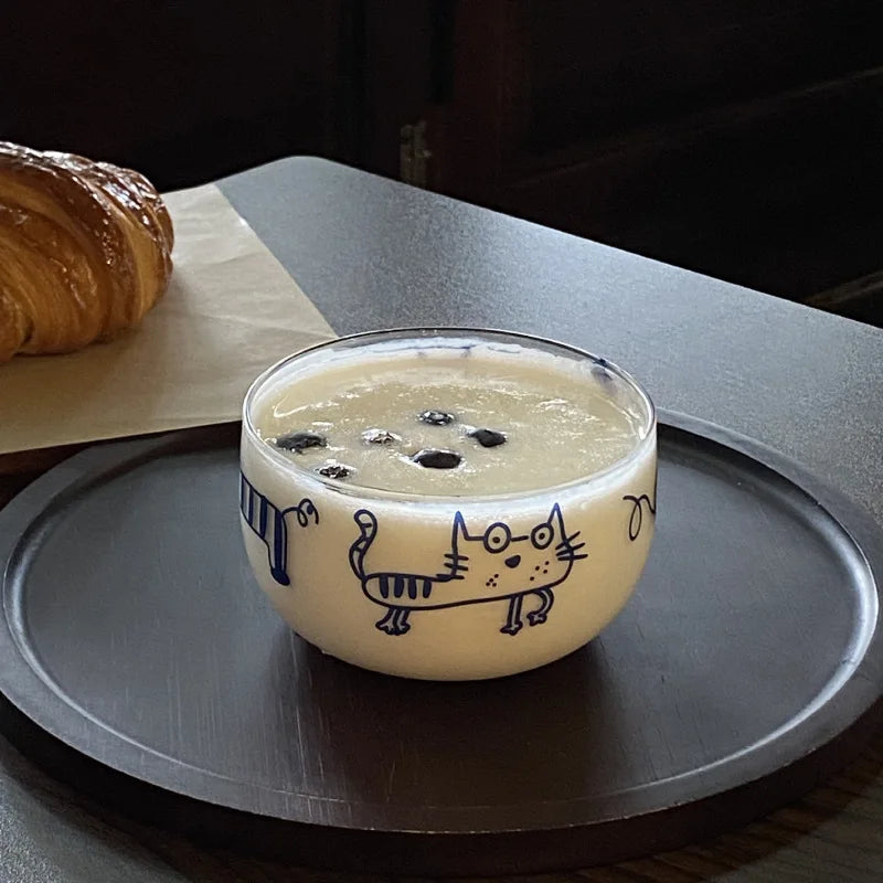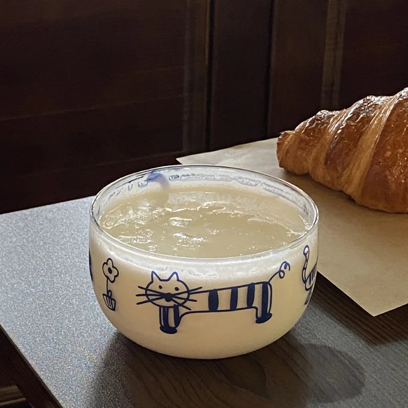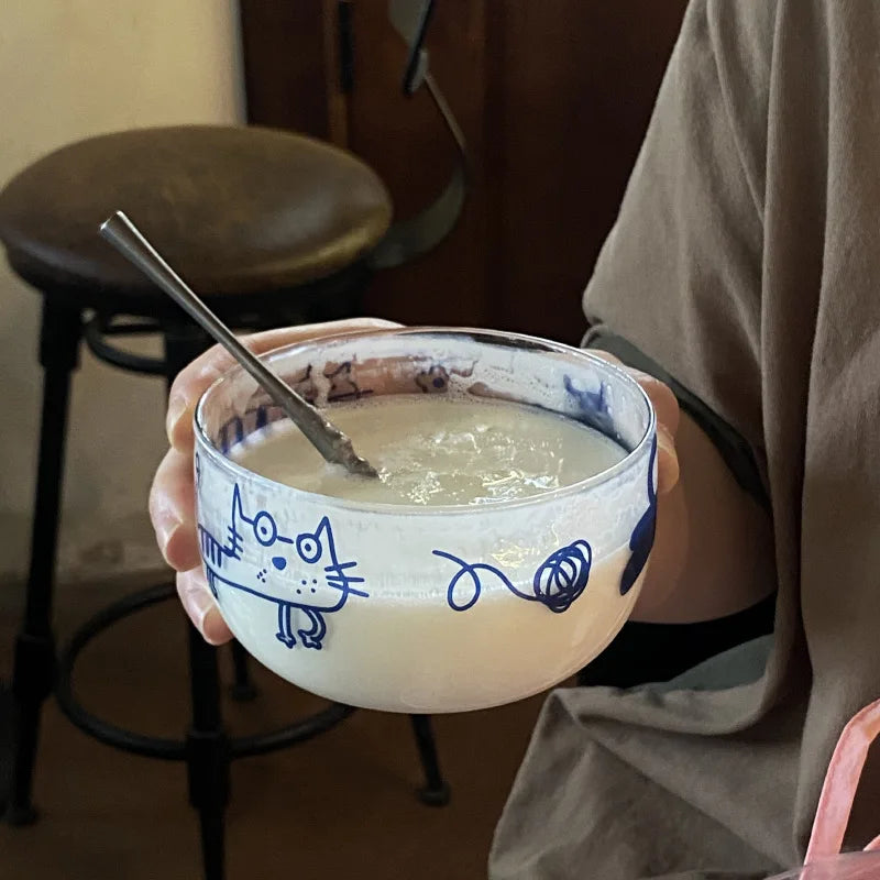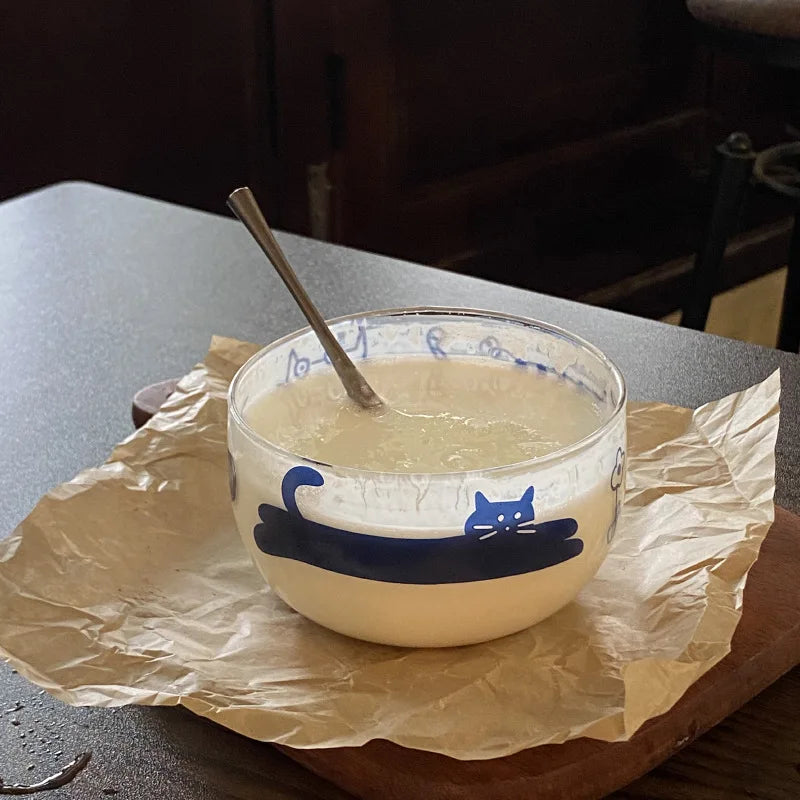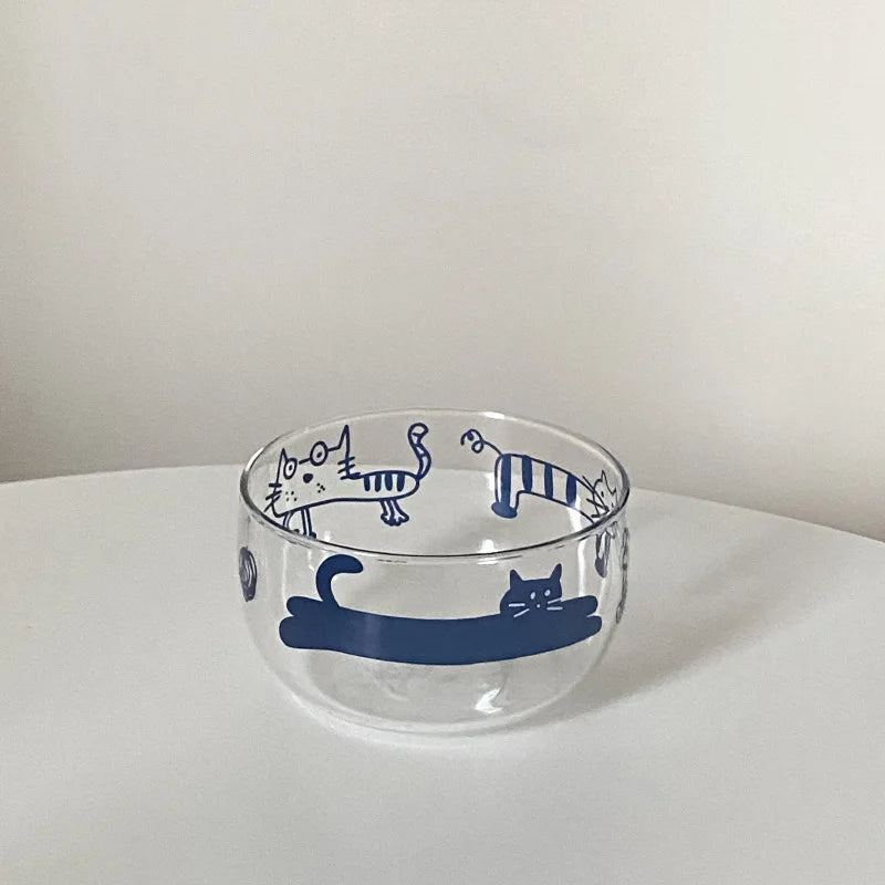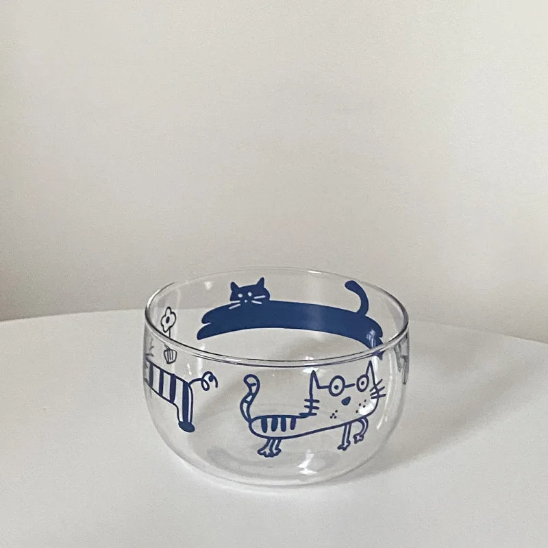 Popxstar Salad Bowl Transparent Cat Line Art Glass Bowl Borosilicate Fruit Yogurt Bowl Microwave Style Dessert Walled Snack Container