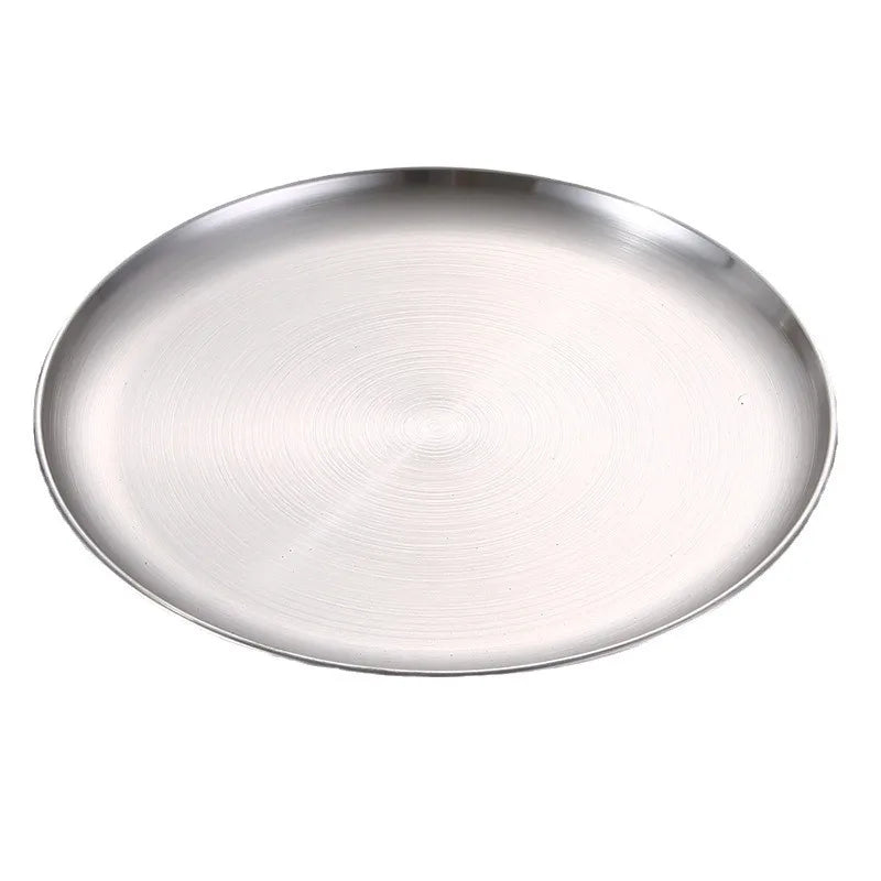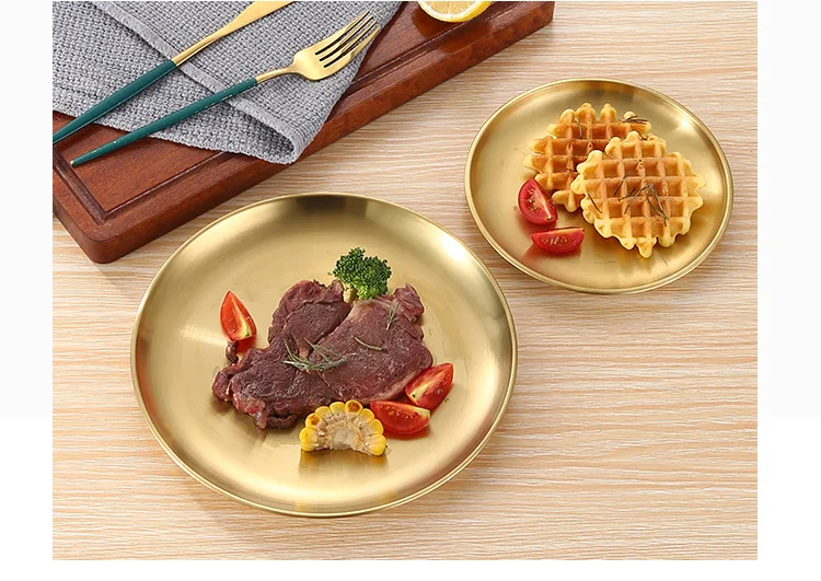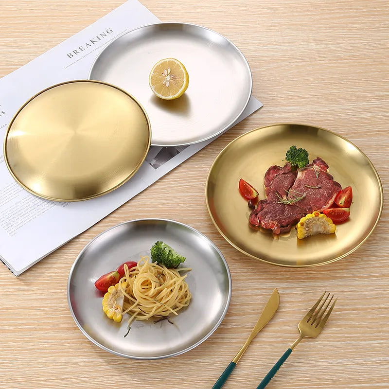 Popxstar 4pcs Large Round Stainless Steel Dinner Plates Fruit Tray- Heavy-Duty Golden Serving Plates Suitable for Weddings, Buffets