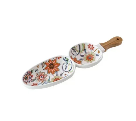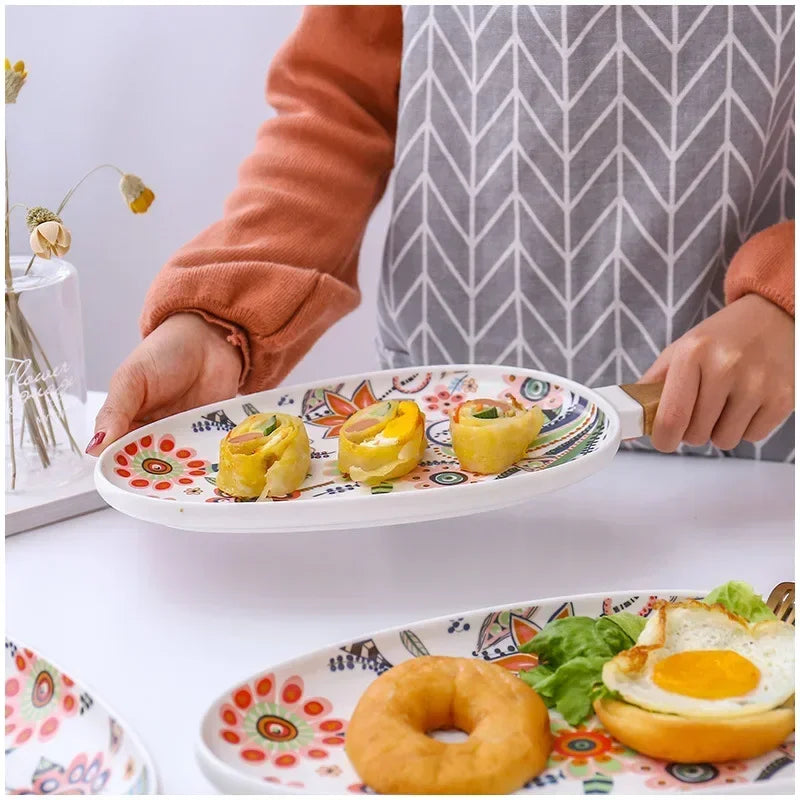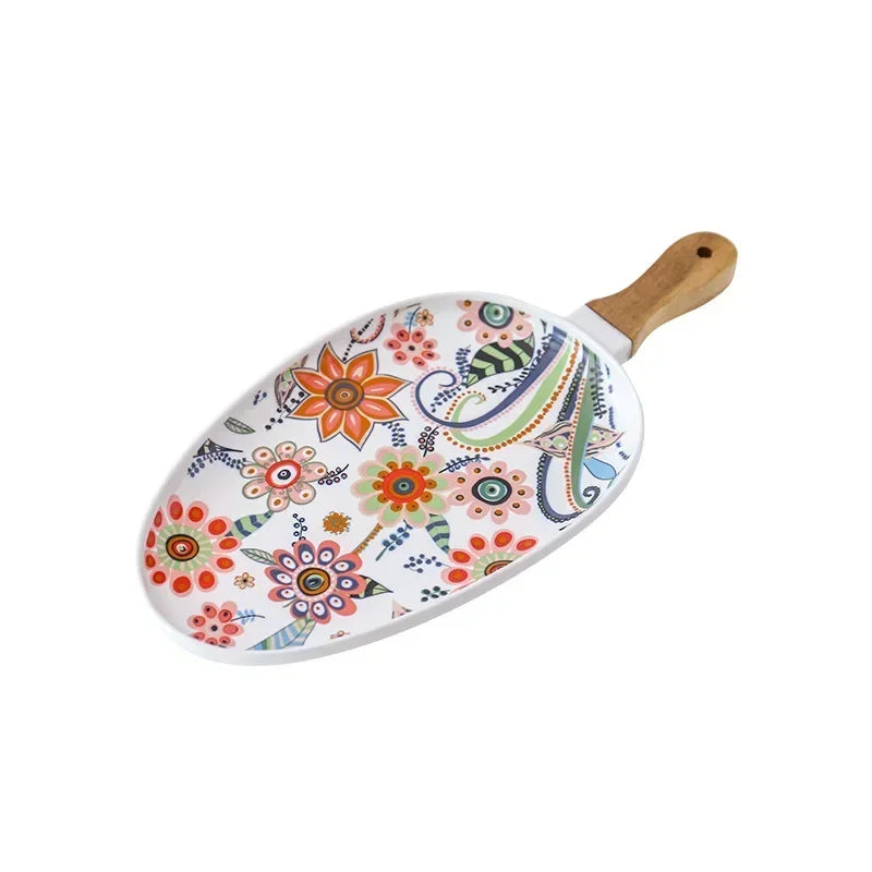 Popxstar Butterfly Love Flower Series High Temperature Matte Glazed Wooden Handle Oval Steak Plate Western Food Plate Ceramic Plate