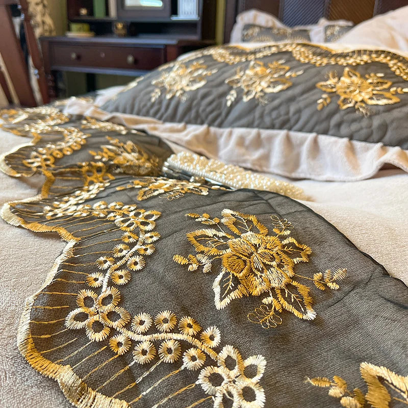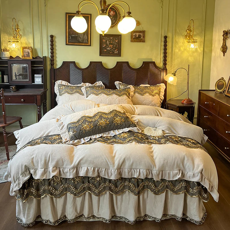 Popxstar European Luxury Lace Embroidery Crystal Velvet Bedding Sets Duvet Cover Ruffles Quilted Bed Skirt Bedspread Pillowcases 4Pcs