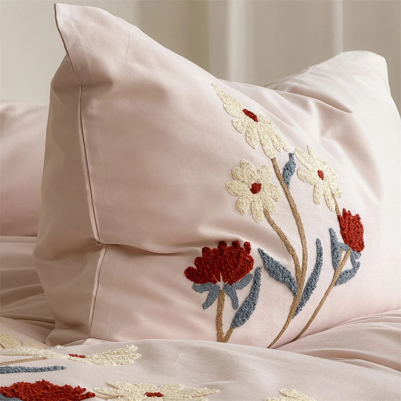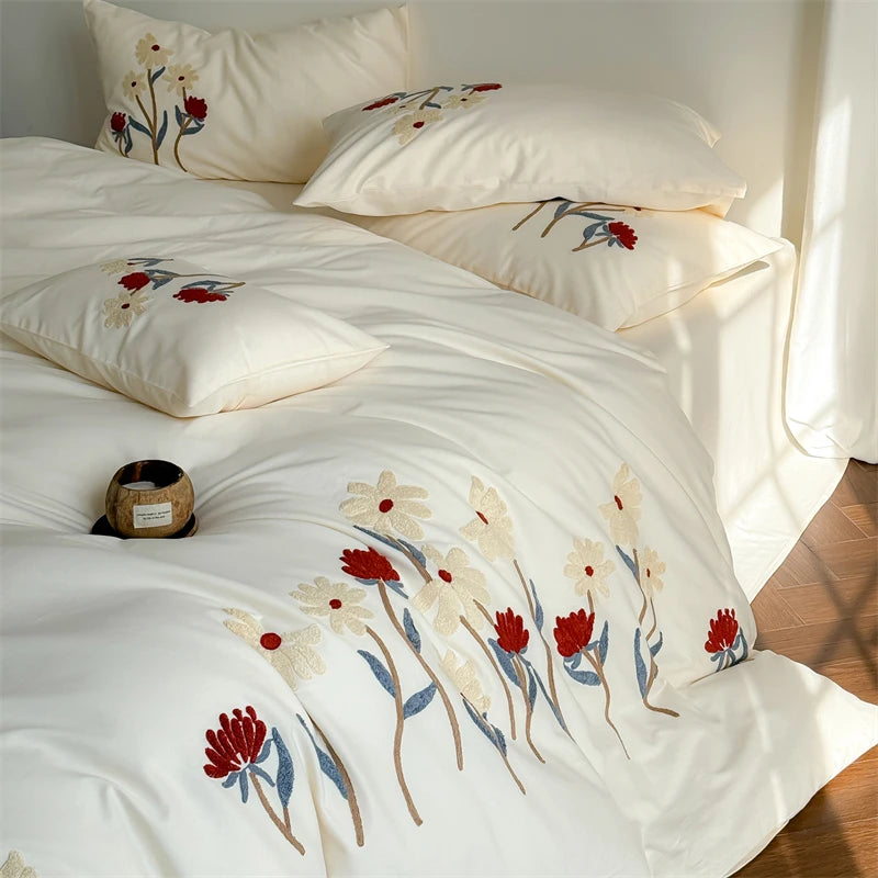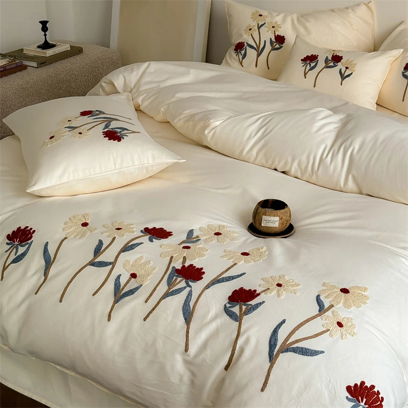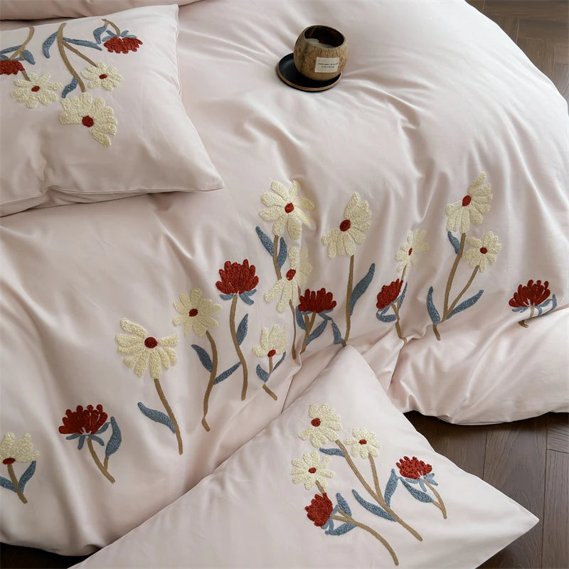 Popxstar Flowers Towel Embroidery Bedding Set 100% Cotton Brushed Single Queen King Size Duvet Cover Flat/Fitted Sheet Pillowcases 3/4Pc