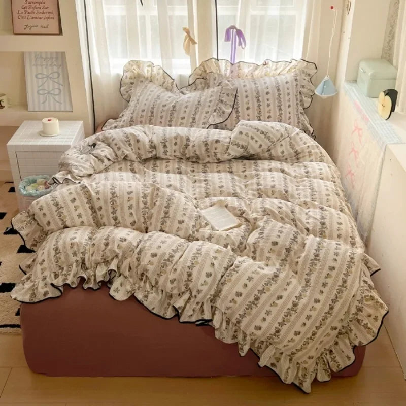 Popxstar New cream lace girl powder grid Korean version bed four-piece set washed cotton double-layer yarn quilt cover dormitory