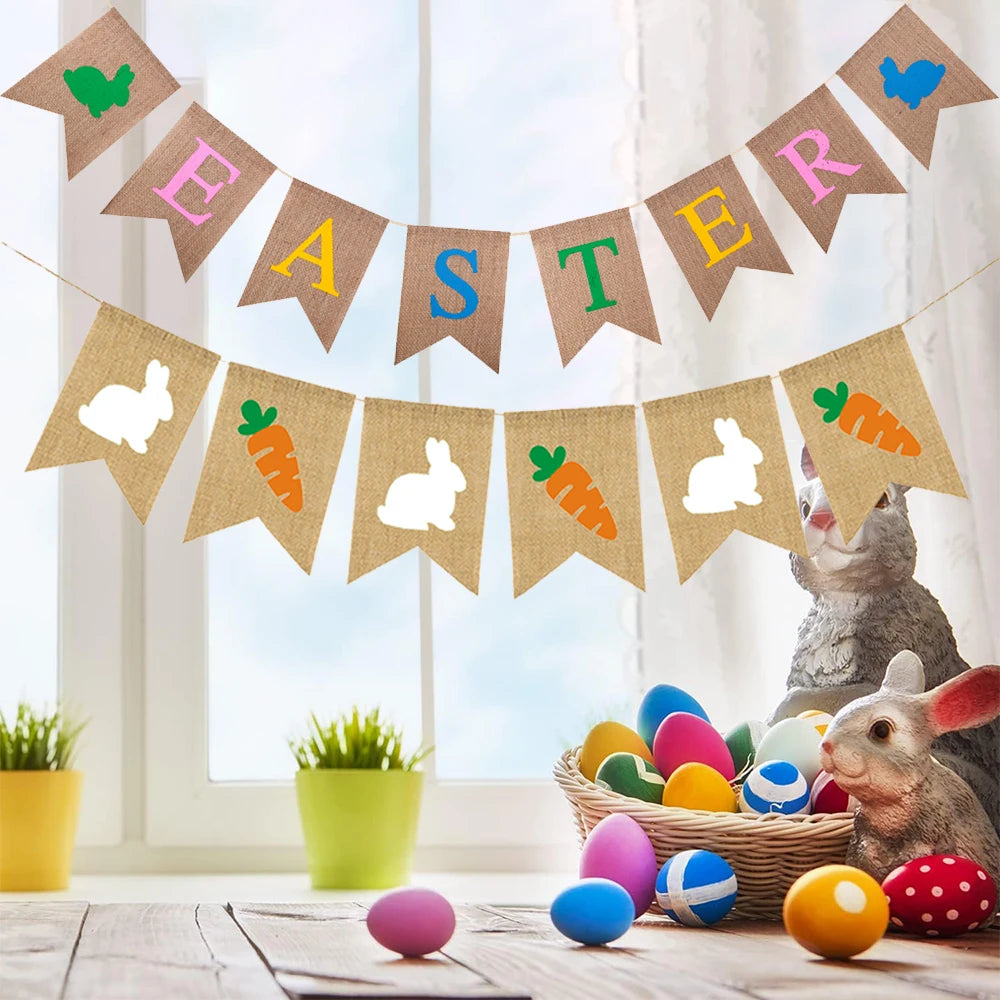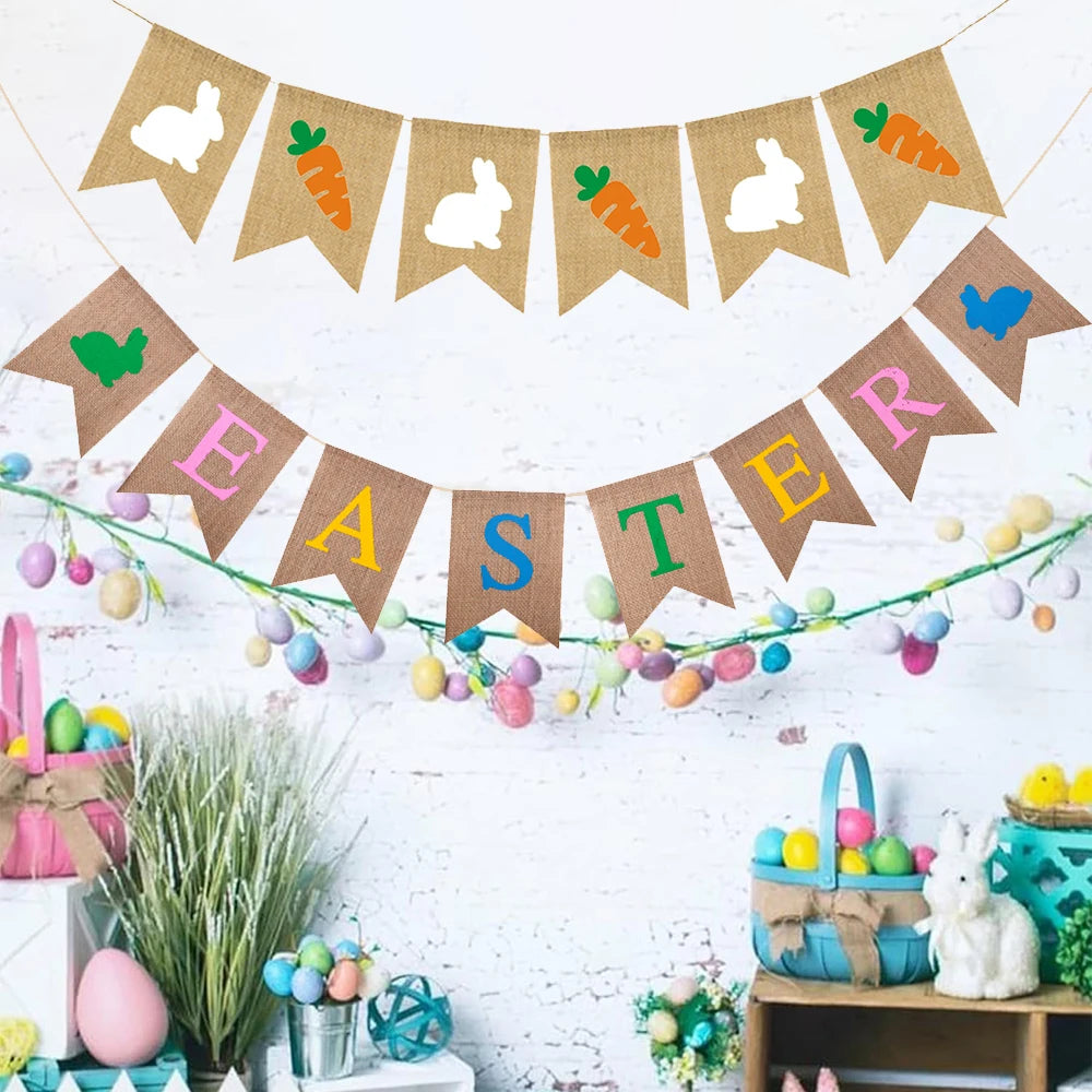 Popxstar Easte Bunny Burlap Baner Cute Rabbit Carrot Hanging Garland Happy Easter Holiday Party Home Fireplace Wall Decorations Supplies
