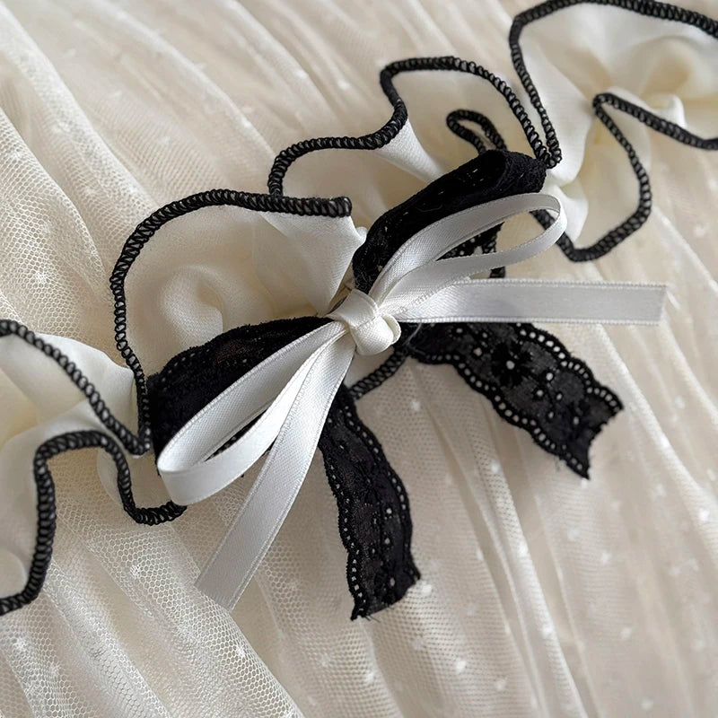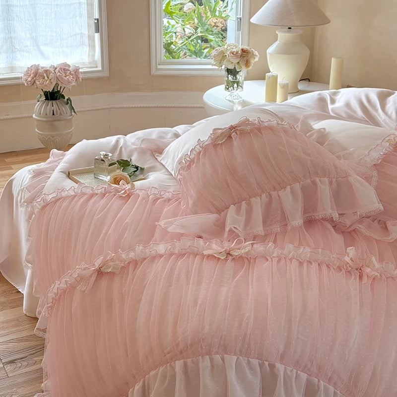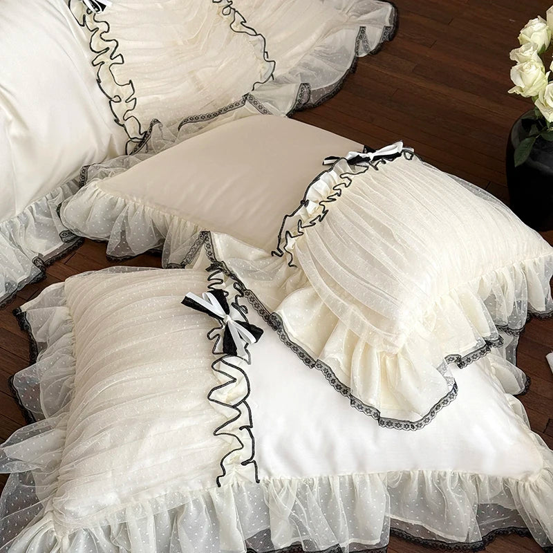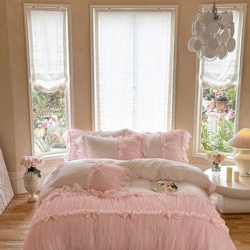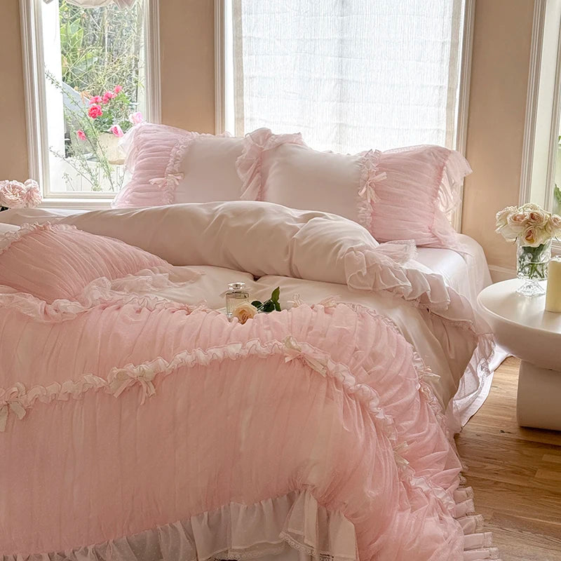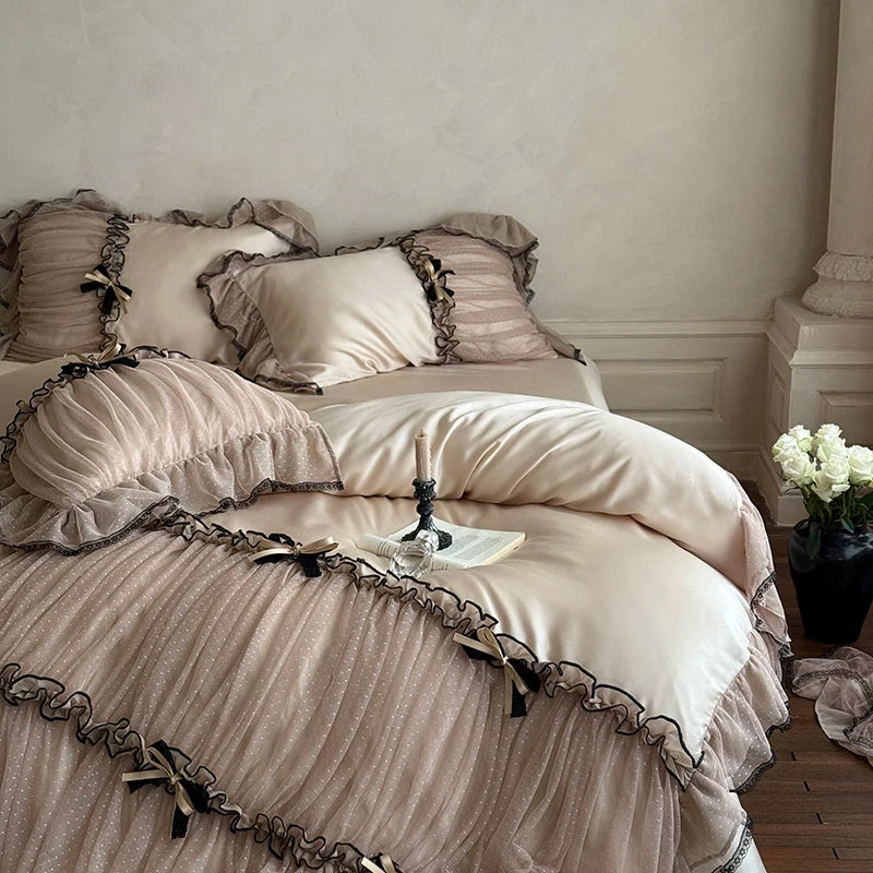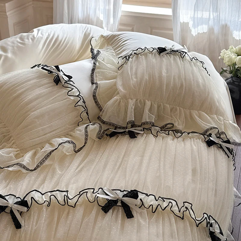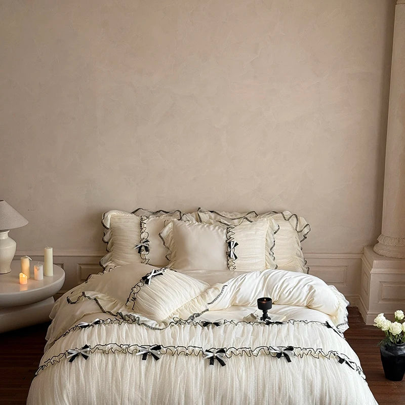 Popxstar Romantic Lace Ruffles Bow Wedding Bedding Set 800TC Lyocell Silky Cooling Duvet Cover Flat/Fitted Bed Sheet Pillowcases 4Pcs