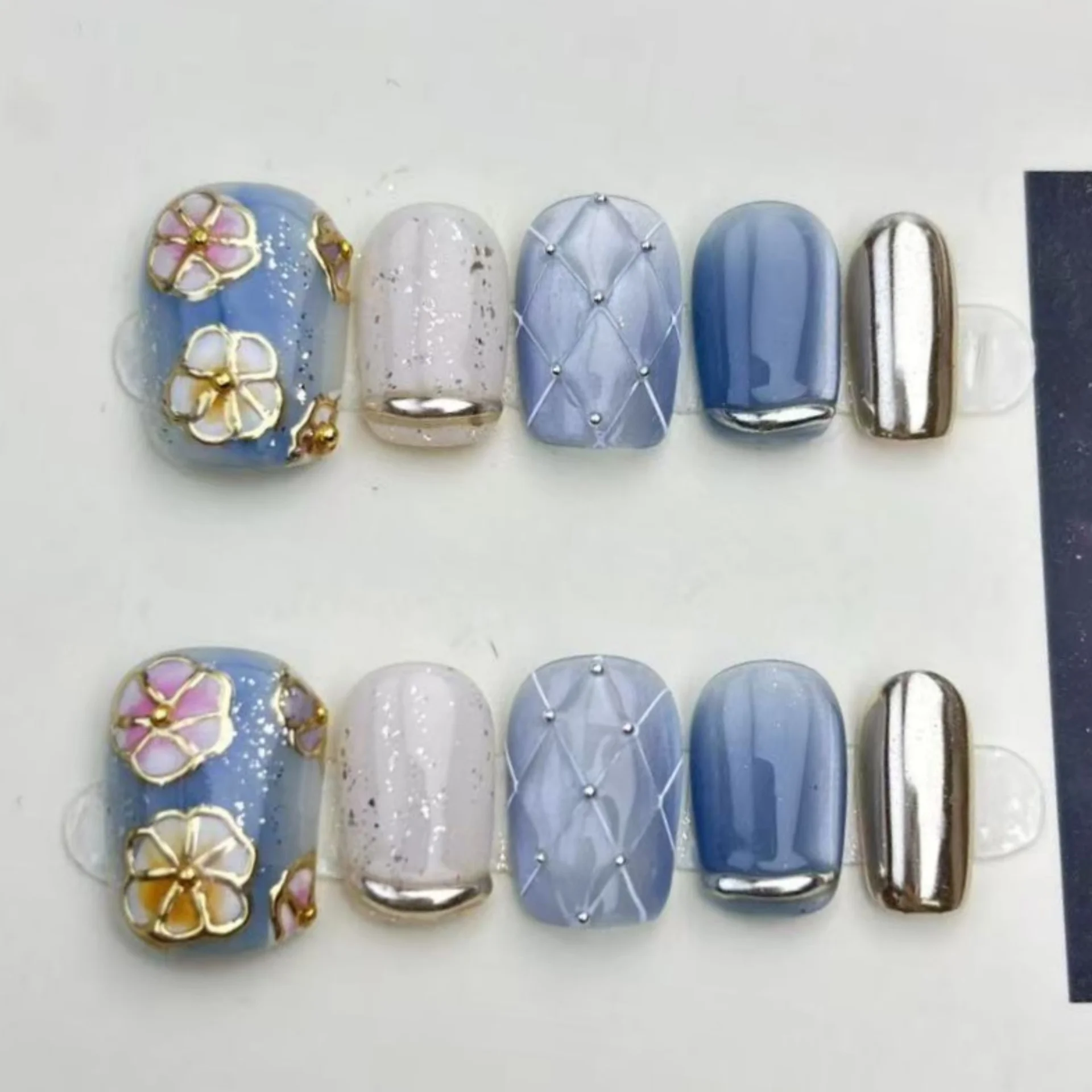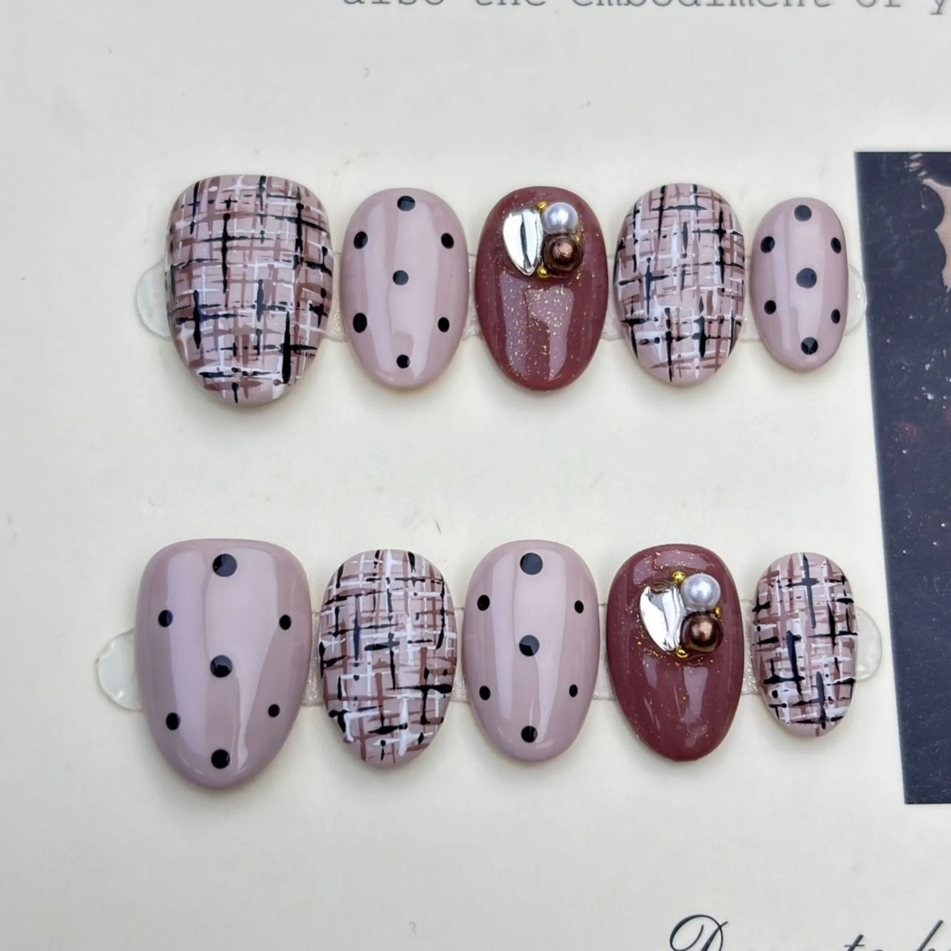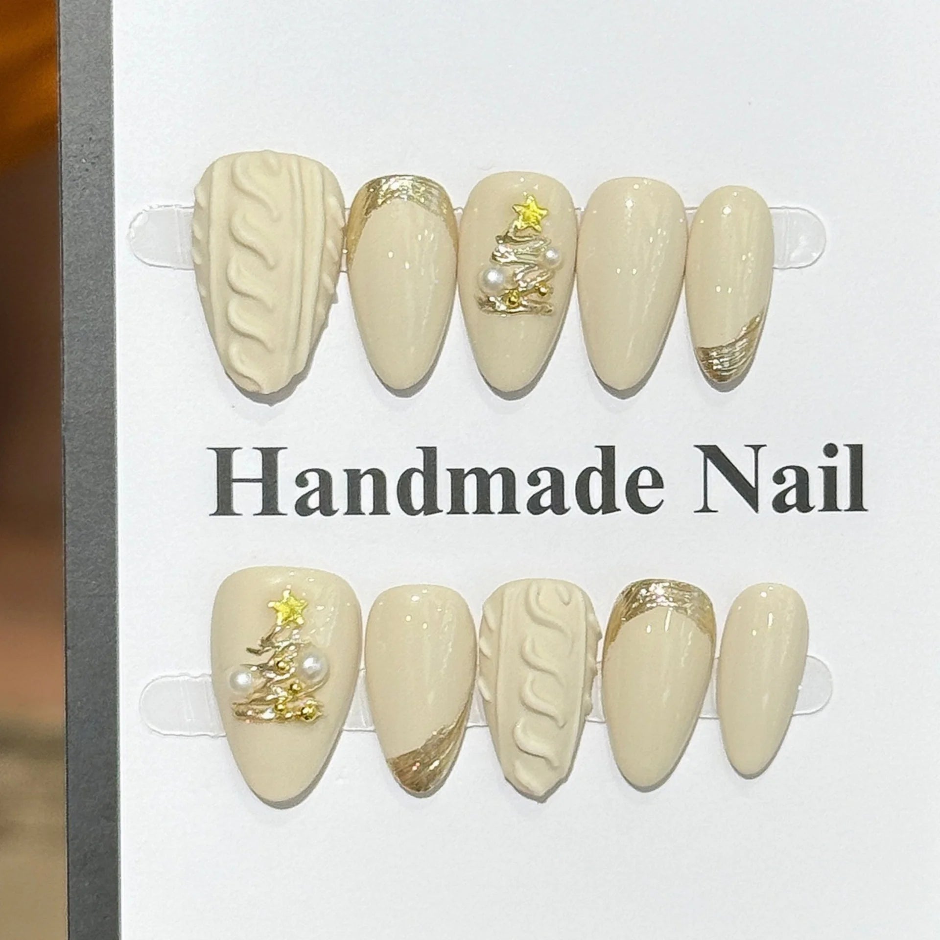 Popxstar 10pcs Yellow Short Almond Handmade False Nails Art with Golden Pattern Design Press on Nails Tips Wearable Christmas Fake Nail