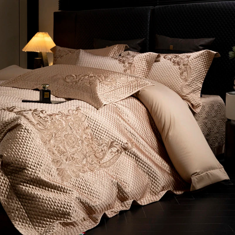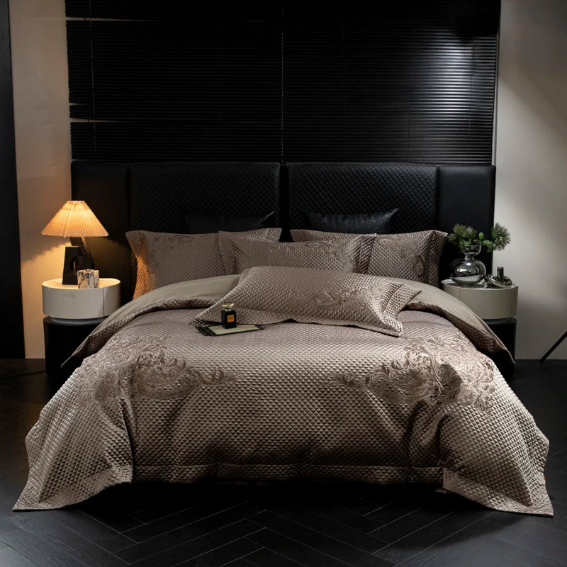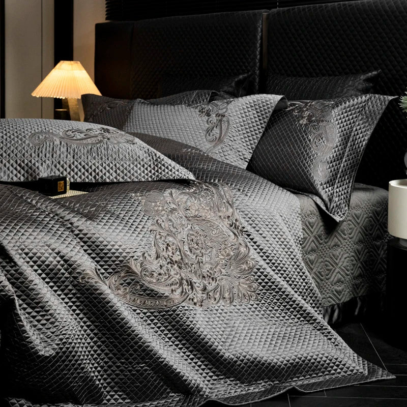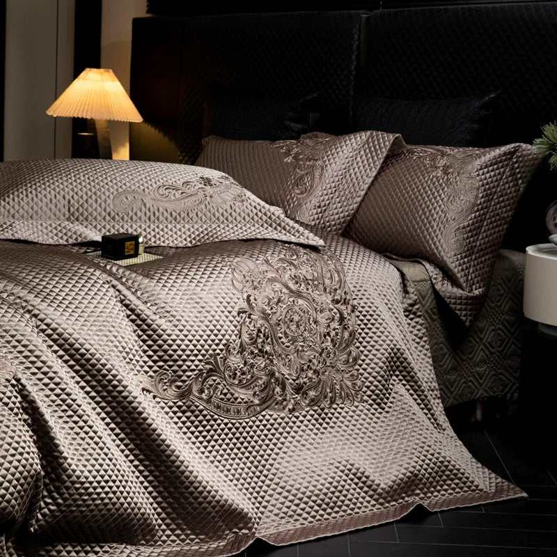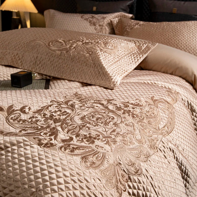 Popxstar 4Pcs European Luxury Brocade Silk Cotton Embroidery Bedding Set Soft Silky Duvet Cover Set With Quilted Bedspread Pillowcases