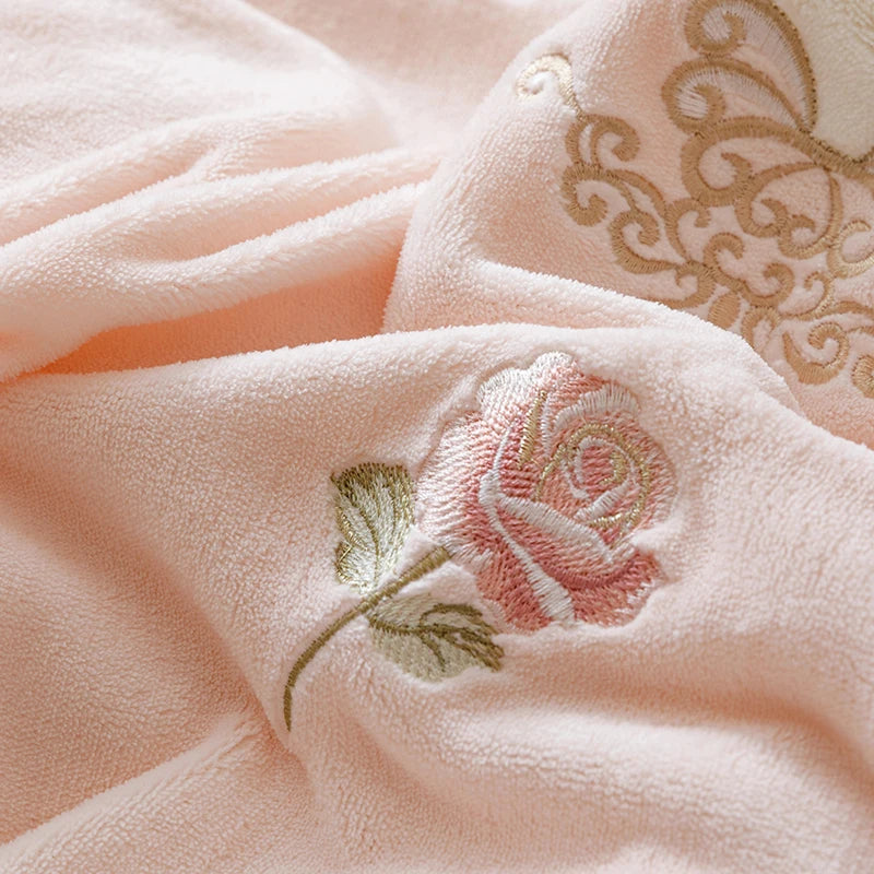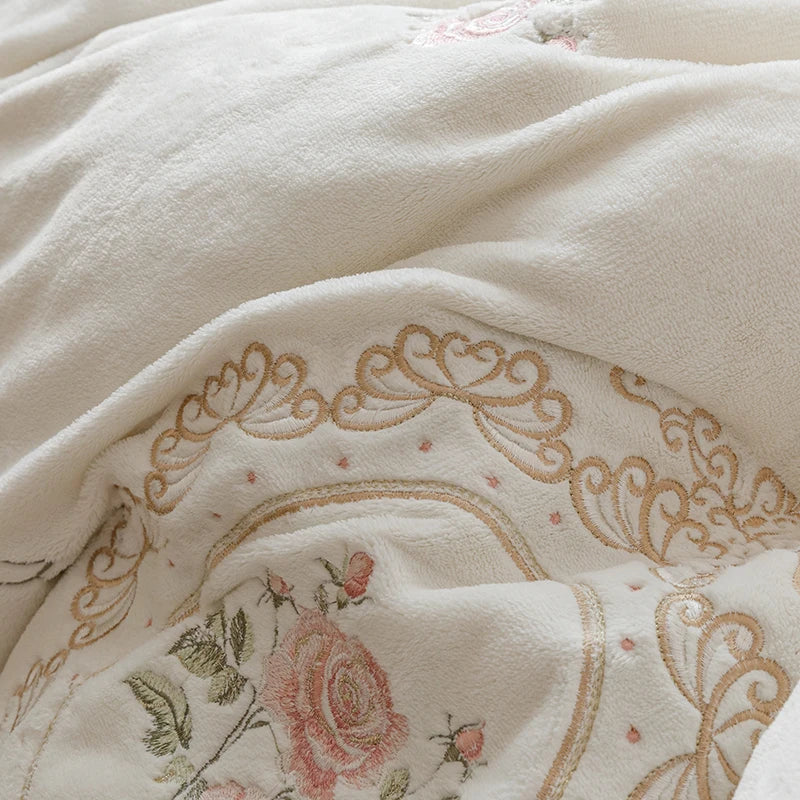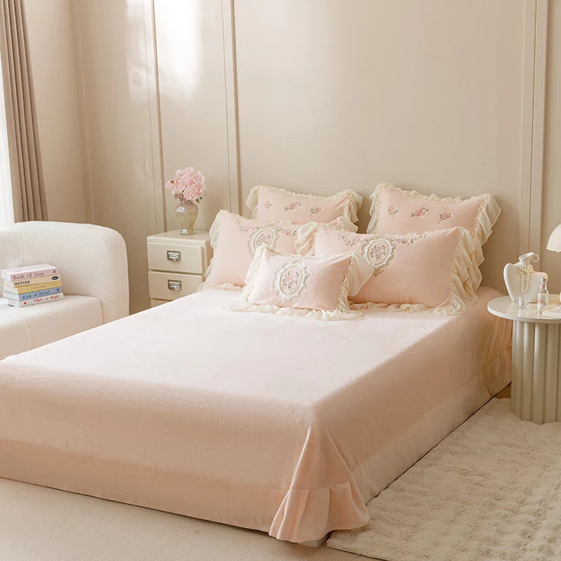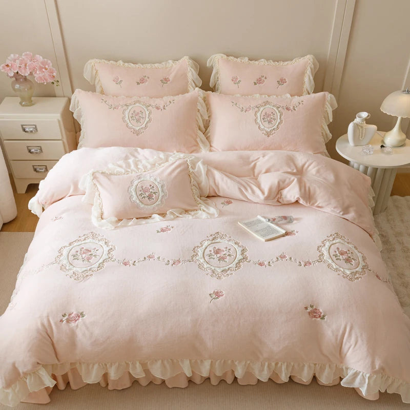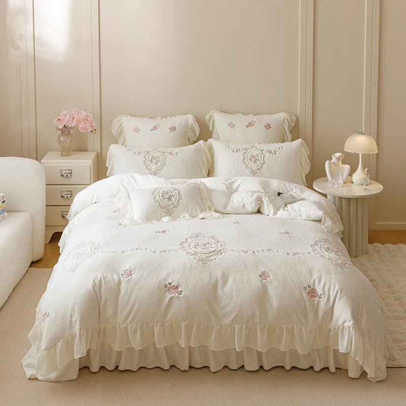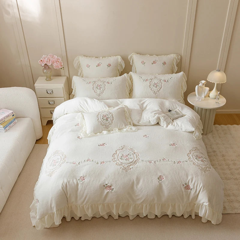 Popxstar 4Pcs Korean Princess Style Bedding Set Rose Flowers Embroidery French Lace Ruffles Milk Velvet Duvet Cover Bed Sheet Pillowcases