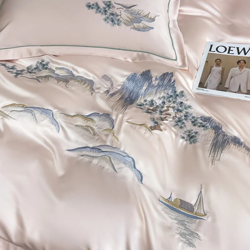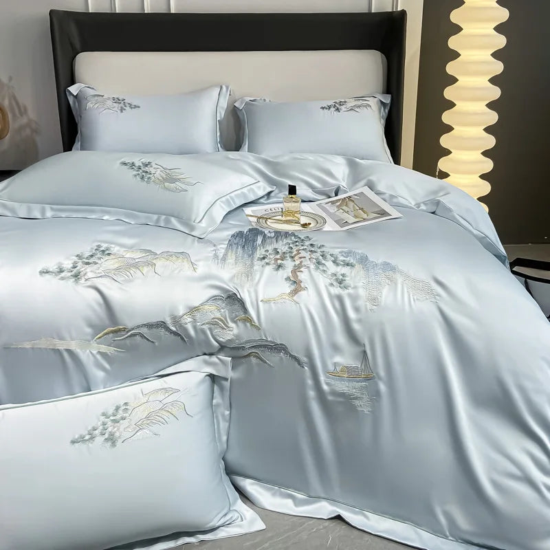 Popxstar 4Pcs New Chinese Style Landscape Embroidery Luxury Bedding Set Silky Duvet Cover Set Soft Quilt Cover Set Bed Sheet Pillowcases