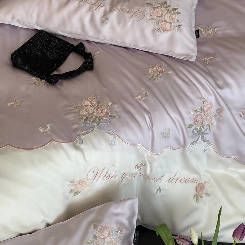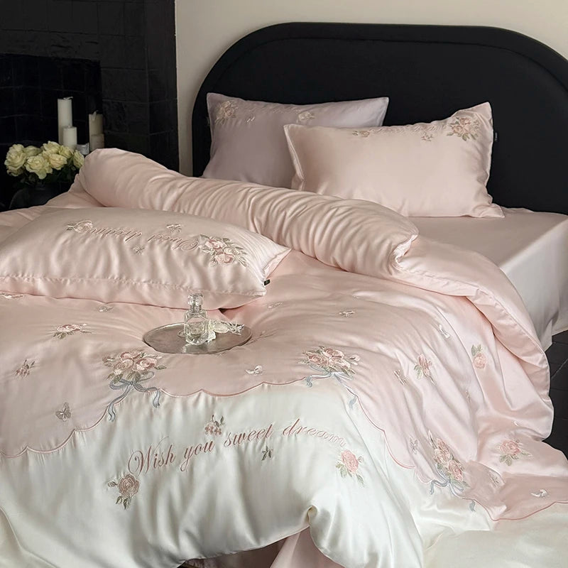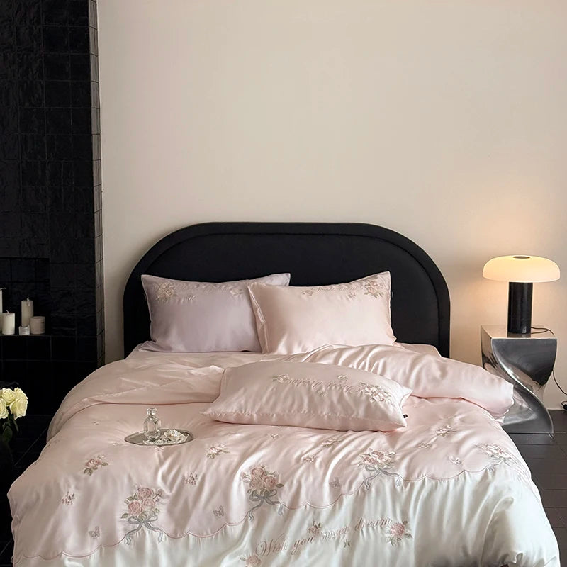 Popxstar 600TC Lyocell Bamboo Fiber Soft Silky Bedding Set Pink Flowers Embroidery Duvet Cover Flat/Fitted Bed Sheet Pillowcases 3/4Pcs